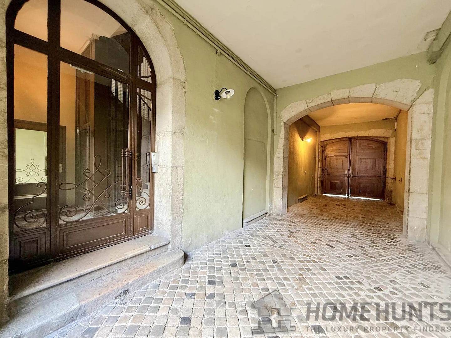 The apartment is accessed via a private covered passageway opening onto a large kitchen with a 3.80m high 1930s glass roof, a living room, two very large bedrooms, a bathroom with shower, a hallway with storage, and a separate toilet.