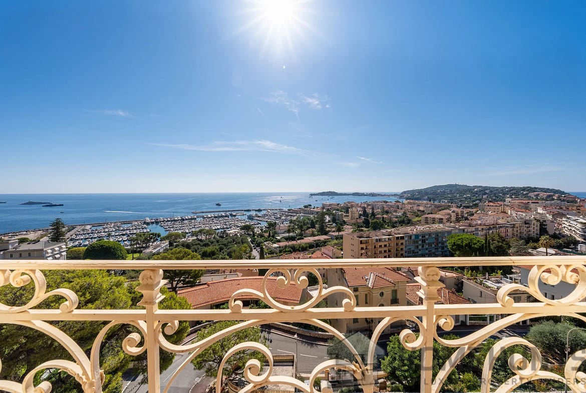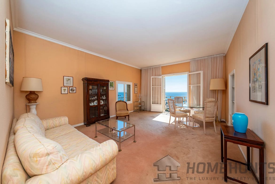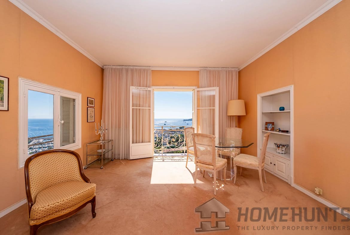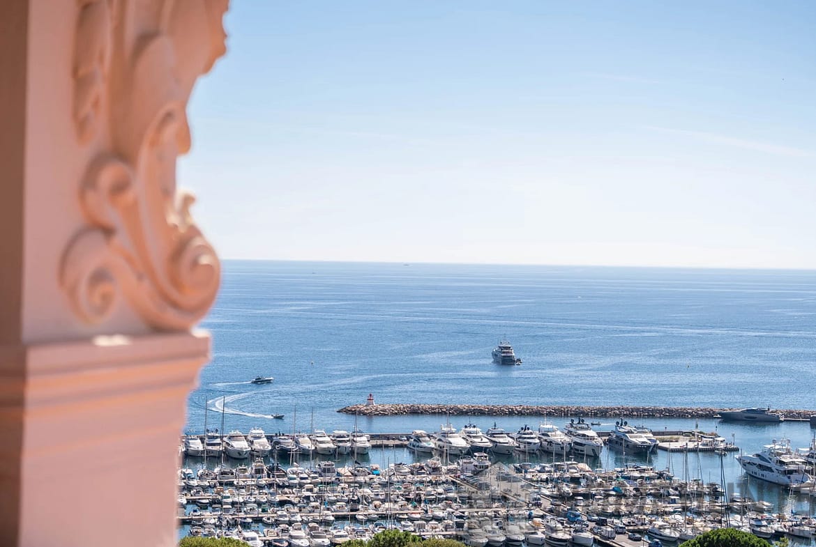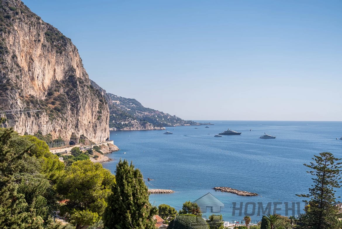 The vast, light-filled living room opens onto a balcony overlooking the Mediterranean, offering a unique view from Saint-Jean-Cap-Ferrat to Cap d’Ail. The independent kitchen, perfectly laid out, completes the living space.