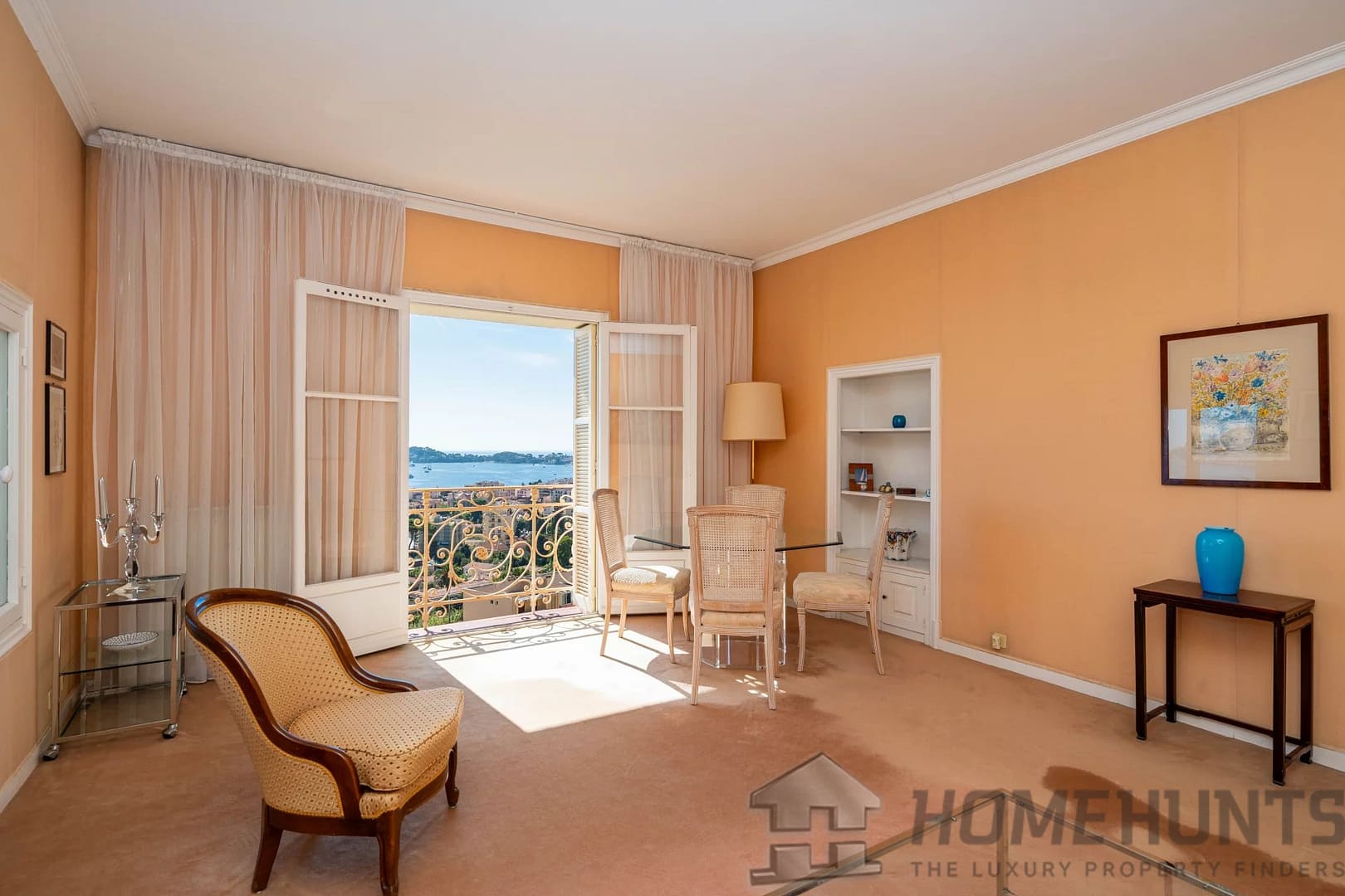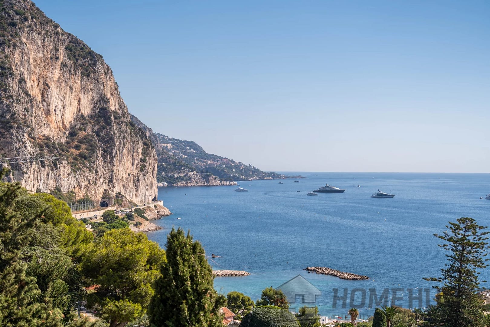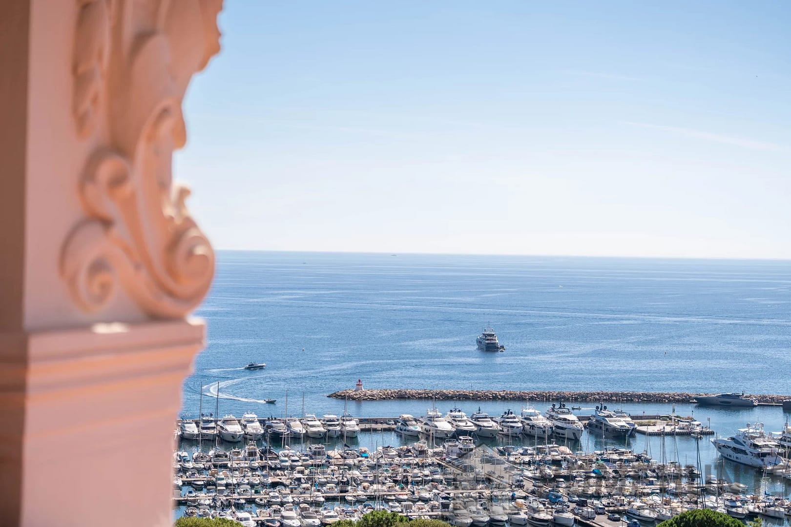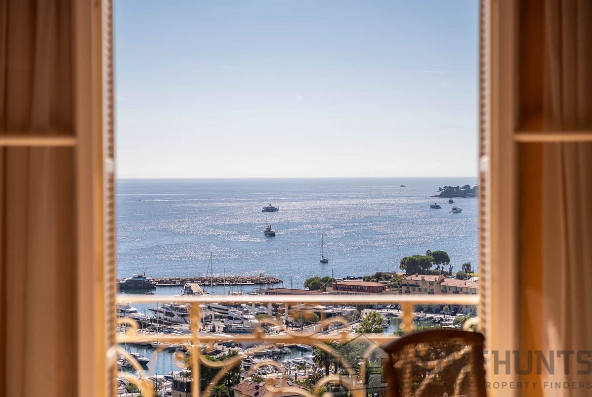 The vast, light-filled living room opens onto a balcony overlooking the Mediterranean, offering a unique view from Saint-Jean-Cap-Ferrat to Cap d’Ail. The independent kitchen, perfectly laid out, completes the living space.