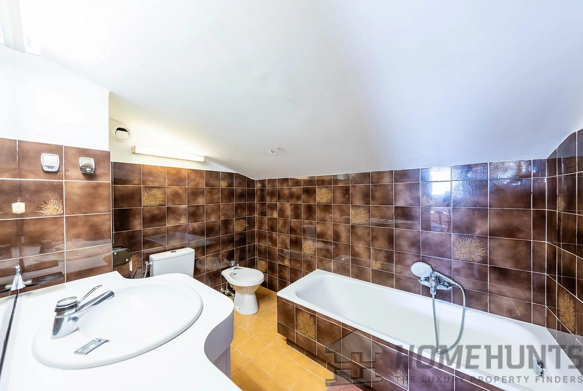 From the entrance, a spacious hall welcomes visitors and can be converted into an additional sleeping area with a built-in sofa bed.