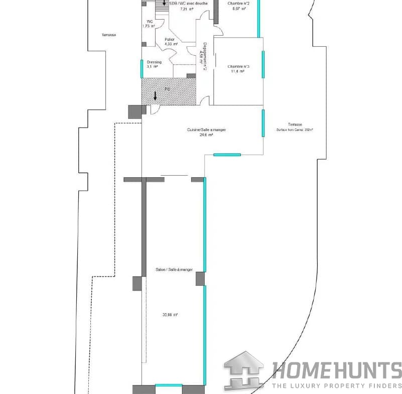 A staircase leads to the 4th floor, comprising a landing, a living-dining room, a kitchen-dining room, two bedrooms, a bathroom, a guest toilet and a dressing room.