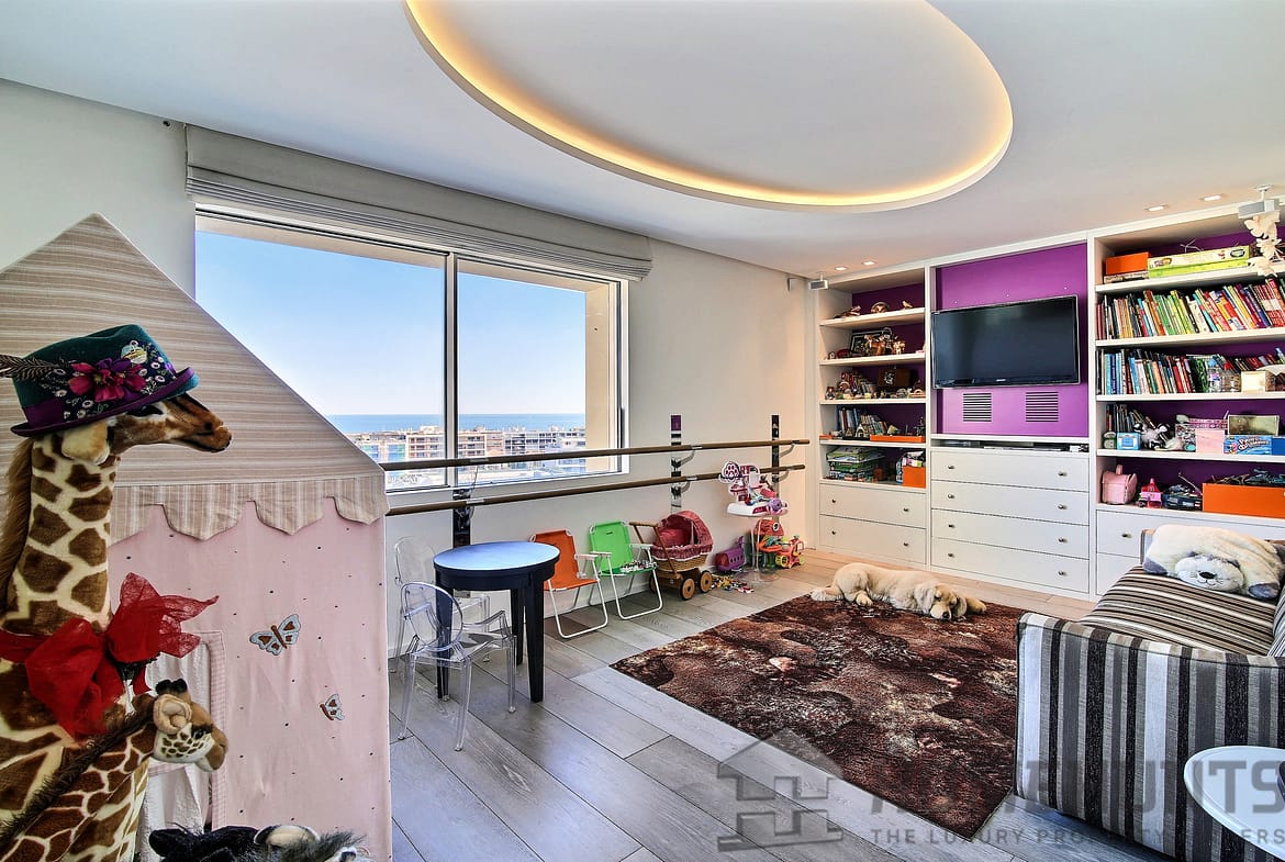 Two further bedrooms with en suite bathrooms overlooking the Croisette and a fifth bedroom with en suite shower room and view of Cap d’Antibes. Children’s dance and games room.