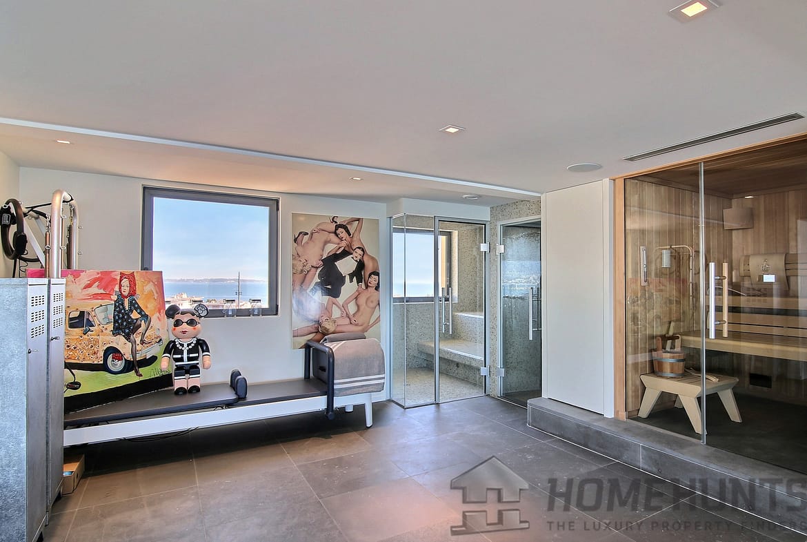 On the 8th floor, the apartment comprises an entrance hall opening onto a beautiful reception room with living room and dining room opening onto a terrace, fully equipped summer kitchen with wine cellar, guest toilet, as well as an indoor swimming pool (7mx3.5m), sauna, hammam and shower.