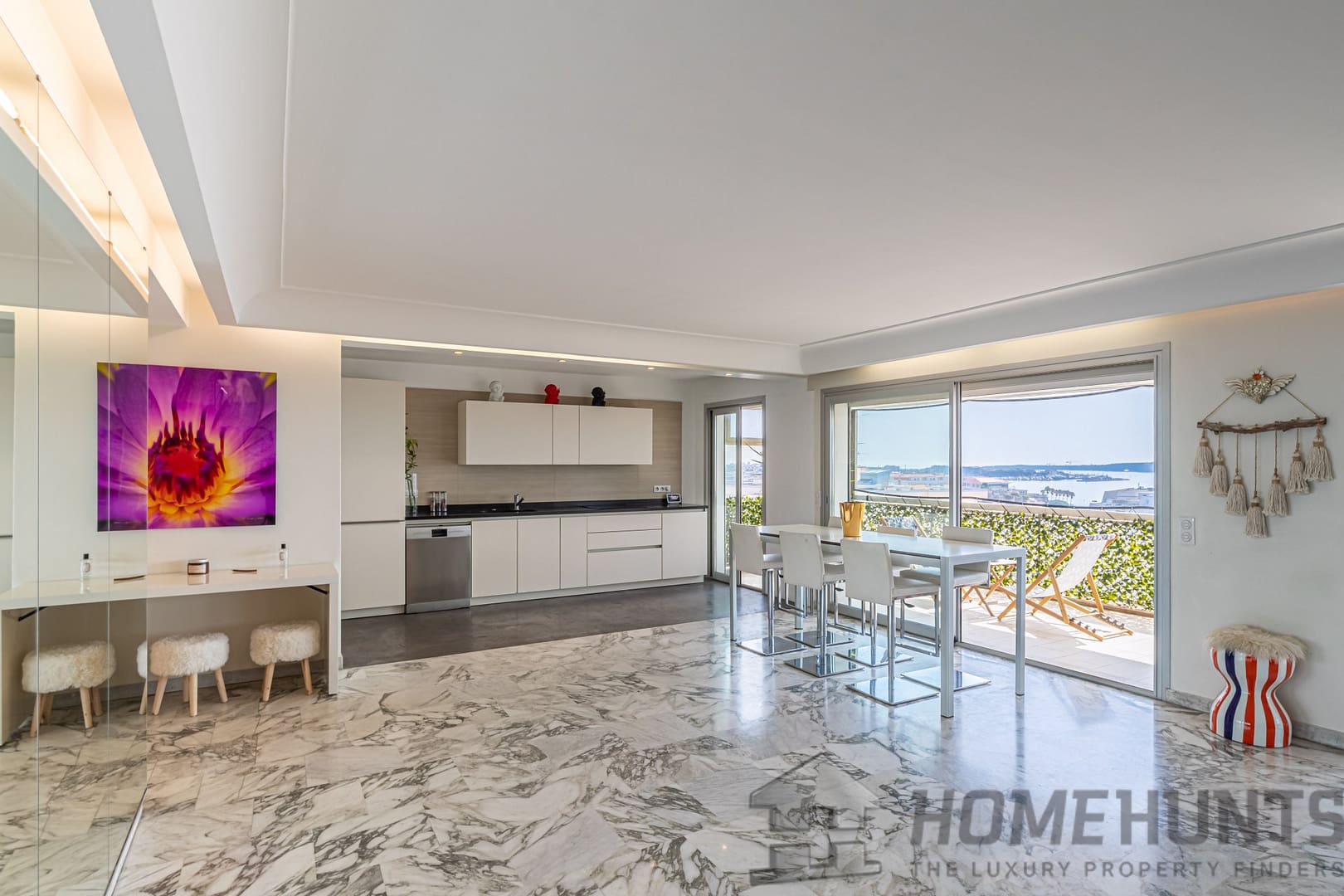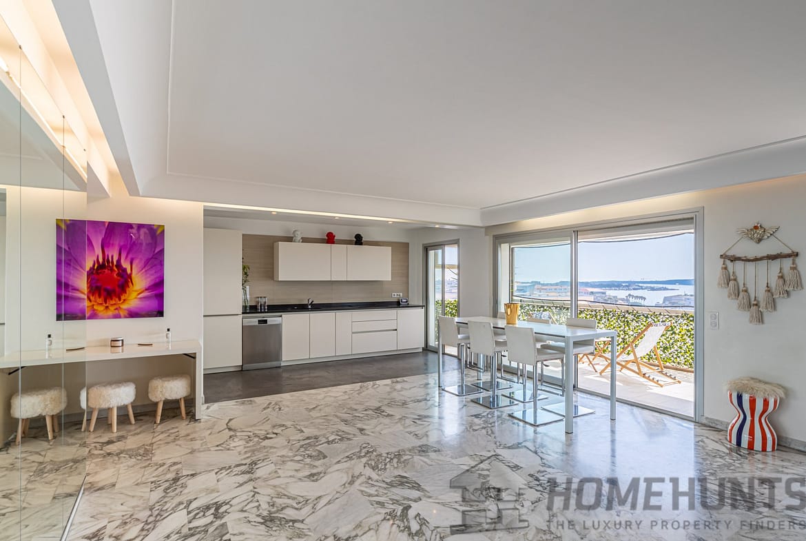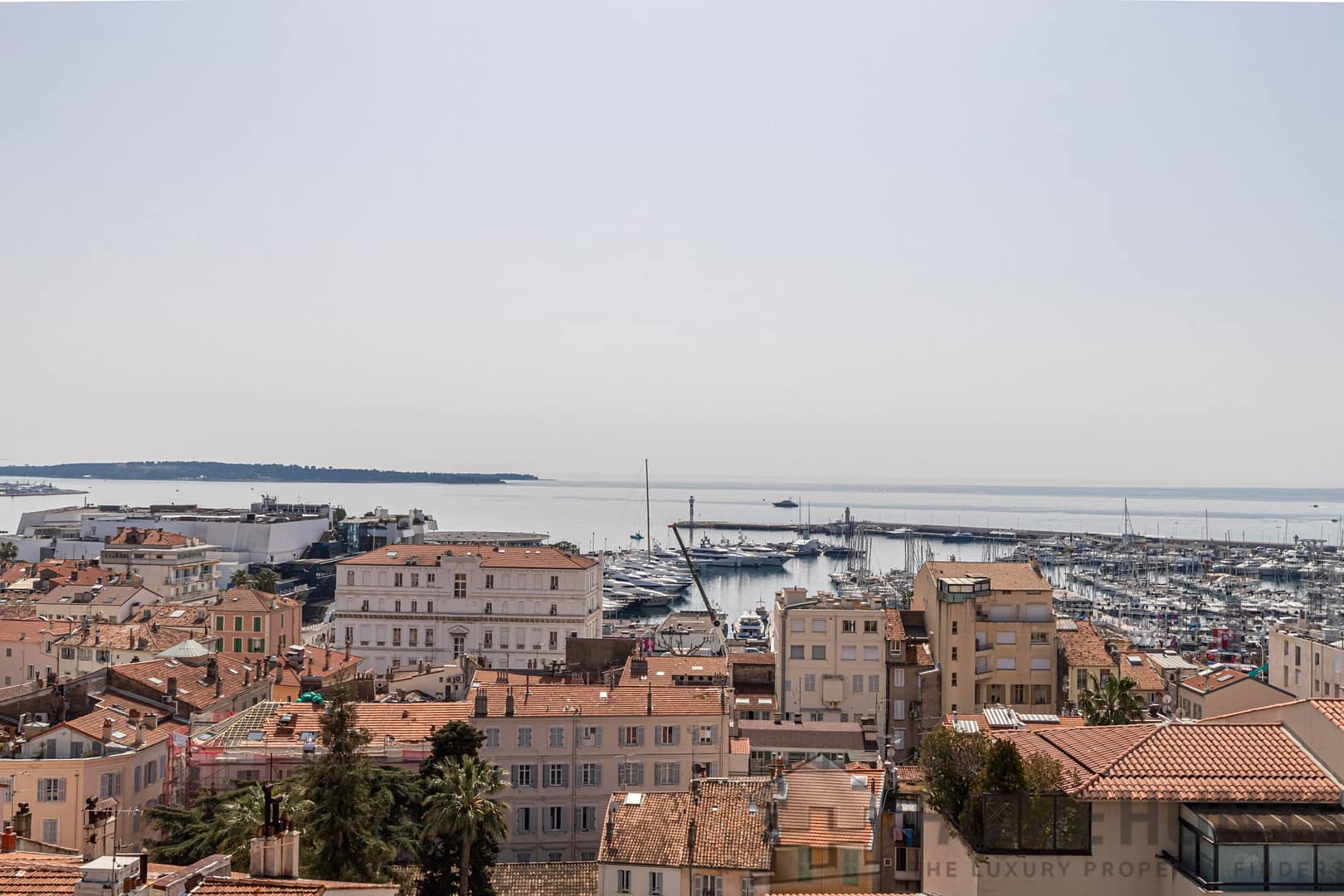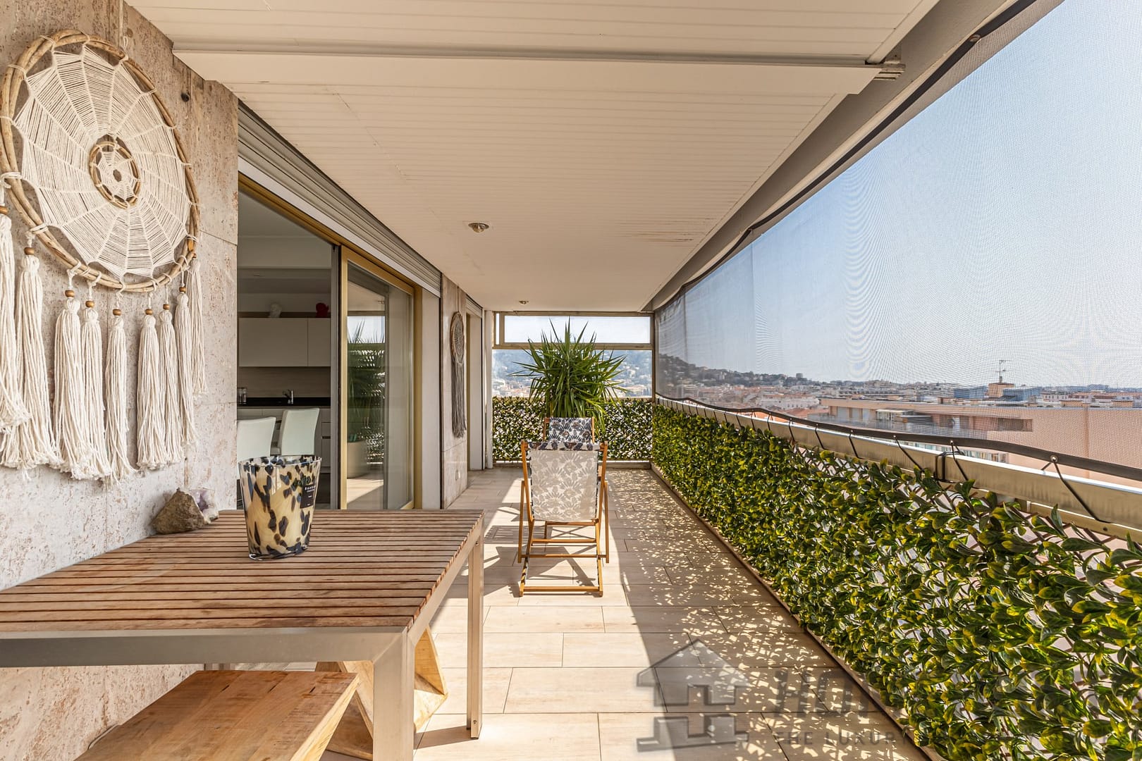 On the 7th floor of a building, this bright 125m2 apartment in the centre of Cannes features a 29m2 south-facing terrace with a panoramic sea view stretching from the Lerins Islands, the port and Le Suquet to the Esterel massif.