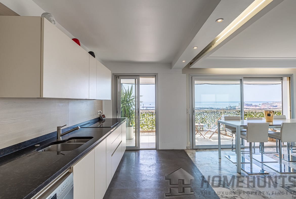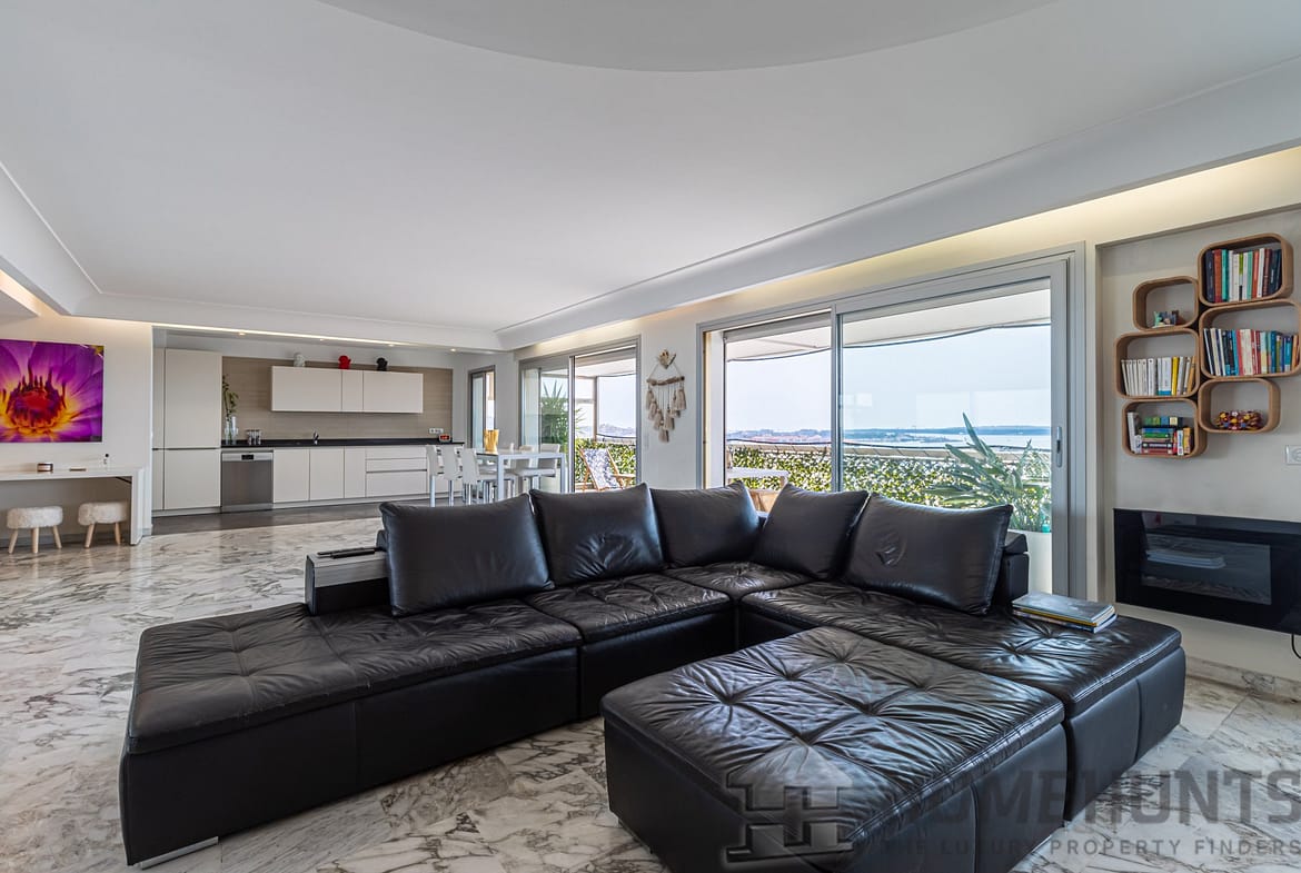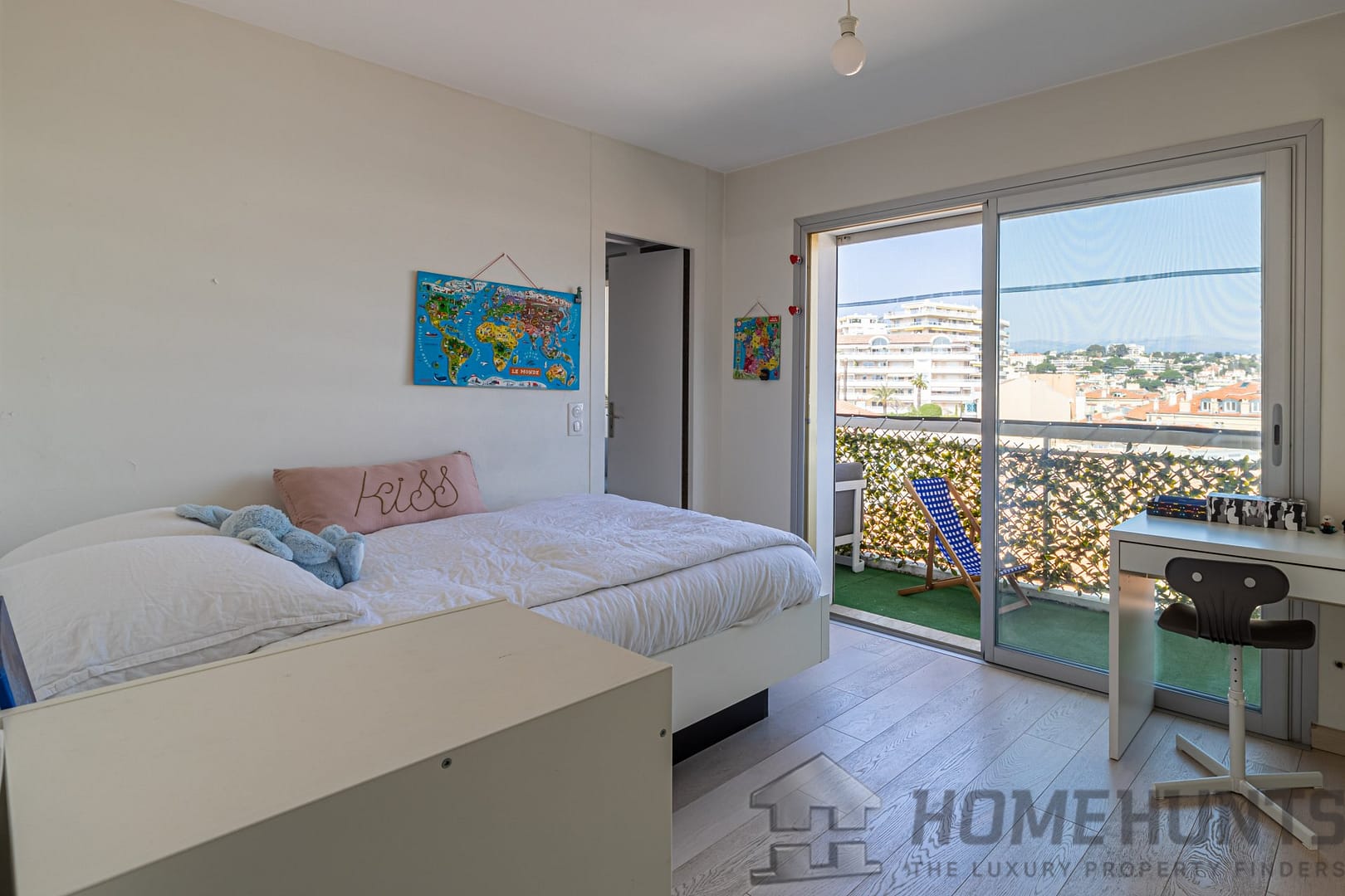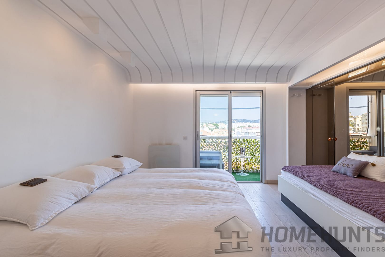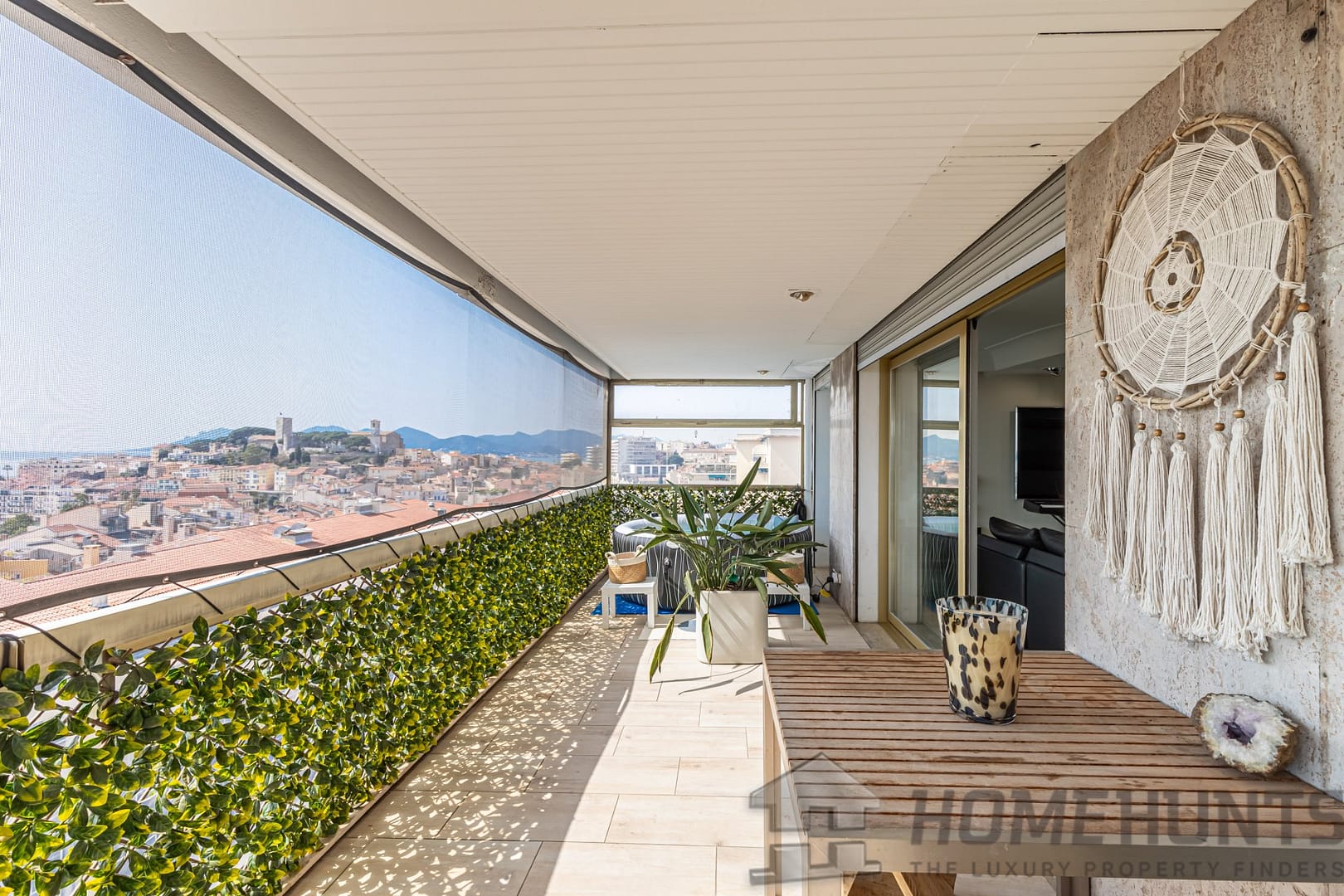 On the 7th floor of a building, this bright 125m2 apartment in the centre of Cannes features a 29m2 south-facing terrace with a panoramic sea view stretching from the Lerins Islands, the port and Le Suquet to the Esterel massif.