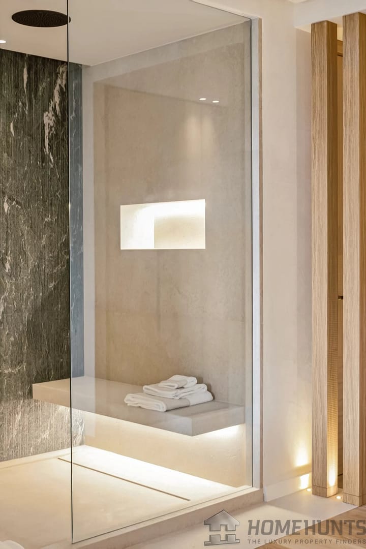 Bright, not overlooked and sheltered from view, it has a large entrance, a very large living-dining room area extending onto a terrace, an ultra-modern fitted kitchen closed by a glass roof, a TV lounge area, a master bedroom en suite with dressing room and bathroom, with private access to the terrace and sea view, two en suite bedrooms with shower room and private balconies, a laundry room for a functional space.