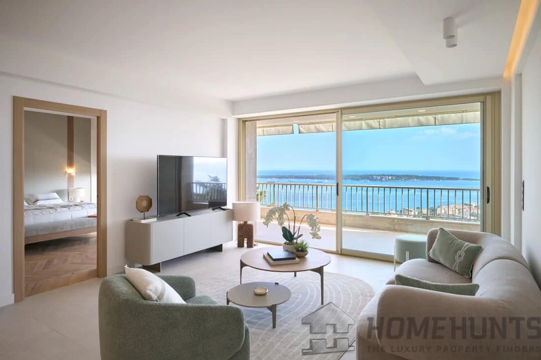 In a luxury residence in the heart of California, secure with 24/7 guard, discover this superb 4-room apartment, completely renovated with high-end services offering a magical sea view over the entire bay of Cannes, the Lérins islands to the Esterel.