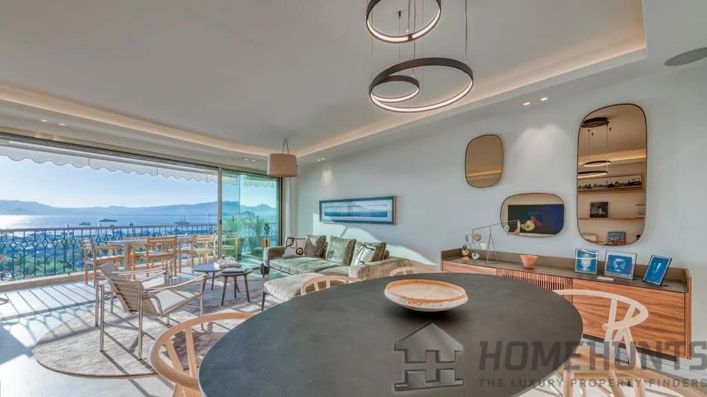 Living room opening onto a large terrace, ideally exposed and allowing you to enjoy a breathtaking view of the lerins islands, the Bay of Cannes, the Esterel mountains, as well as the breathtaking sunsets.