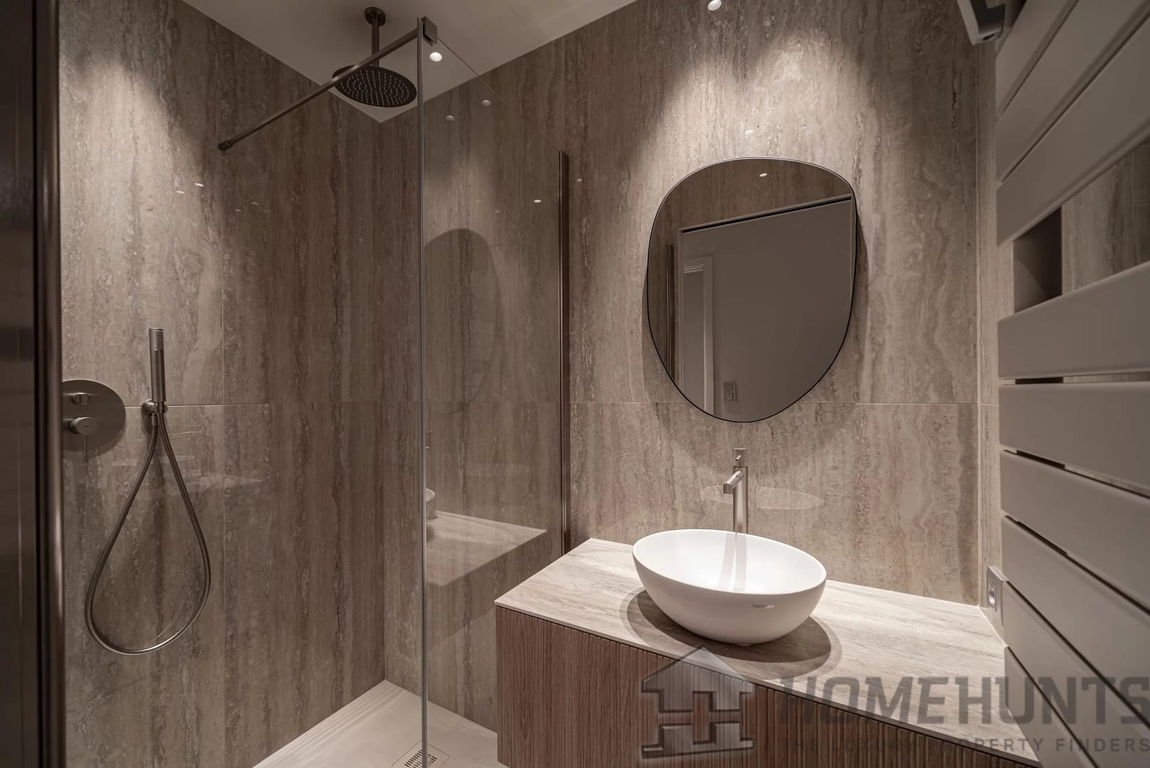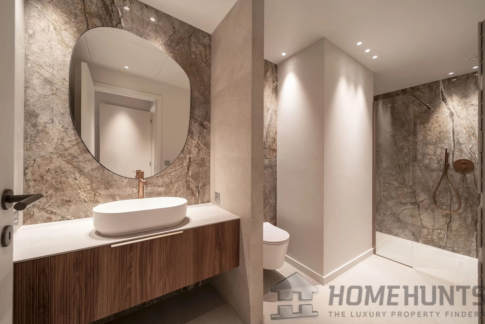 The apartment of approximately 80 m2 of living area, features an entrance hall, a spacious reception room with an open-plan kitchen, a guest cloakroom, and two en suite bedrooms, each with its own shower room and dressing.
