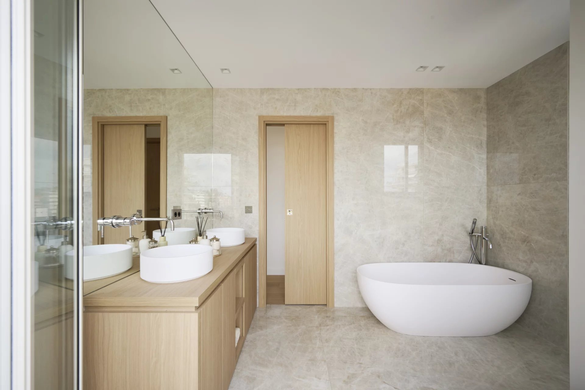 Located on the 4th and top floor, it comprises a large, bright living room, a fitted kitchen, two bedrooms, two bathrooms, as well as a laundry room.
