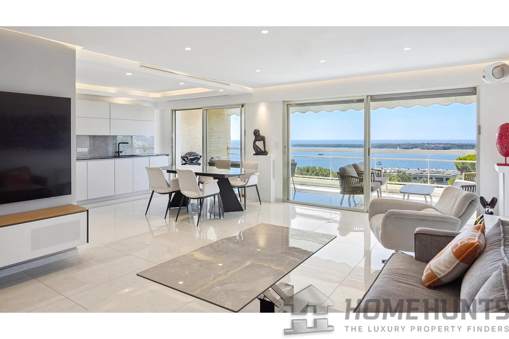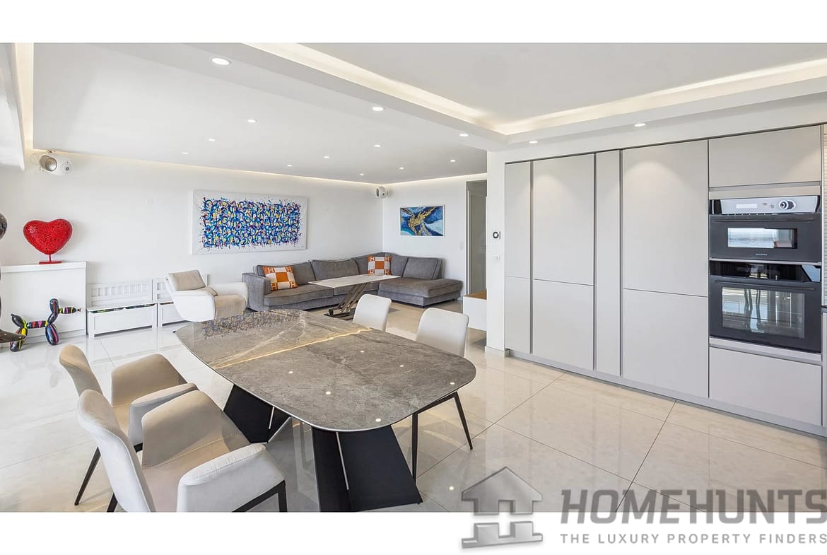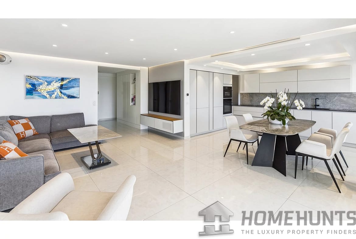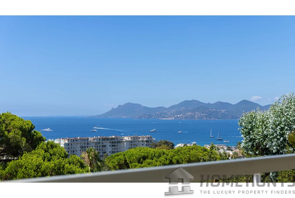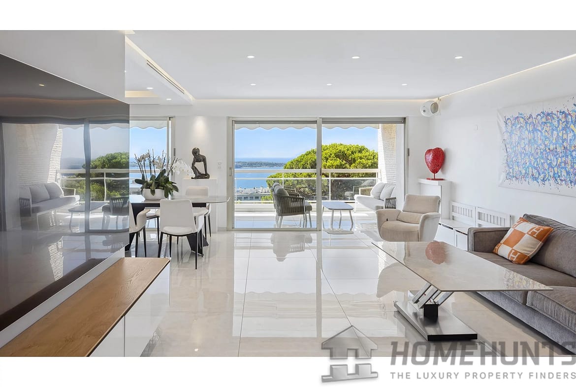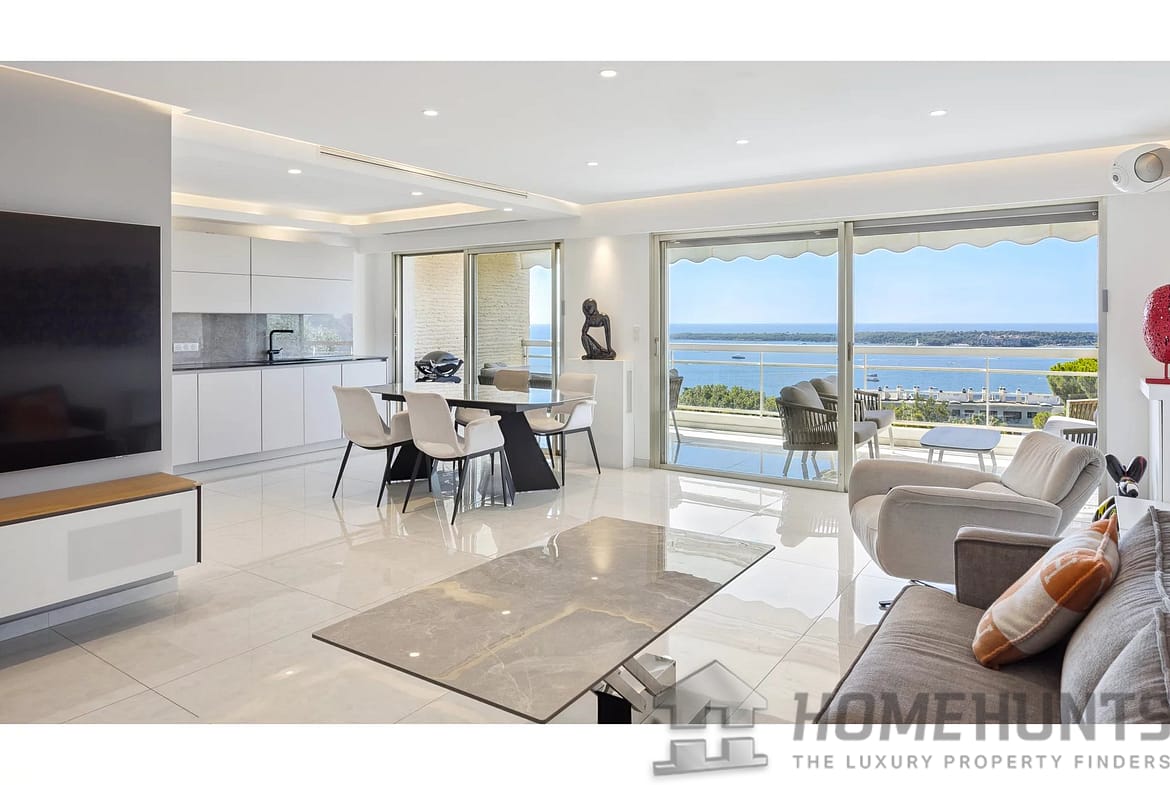 This contemporary 85 m2 apartment on the 3rd floor is in excellent condition and boasts a panoramic view of the sea and the Lerins Islands, with no overlooking buildings. The bright living room opens onto a modern, fully equipped kitchen, creating a pleasant and functional living space.