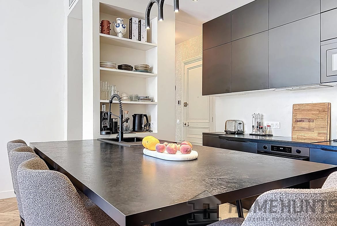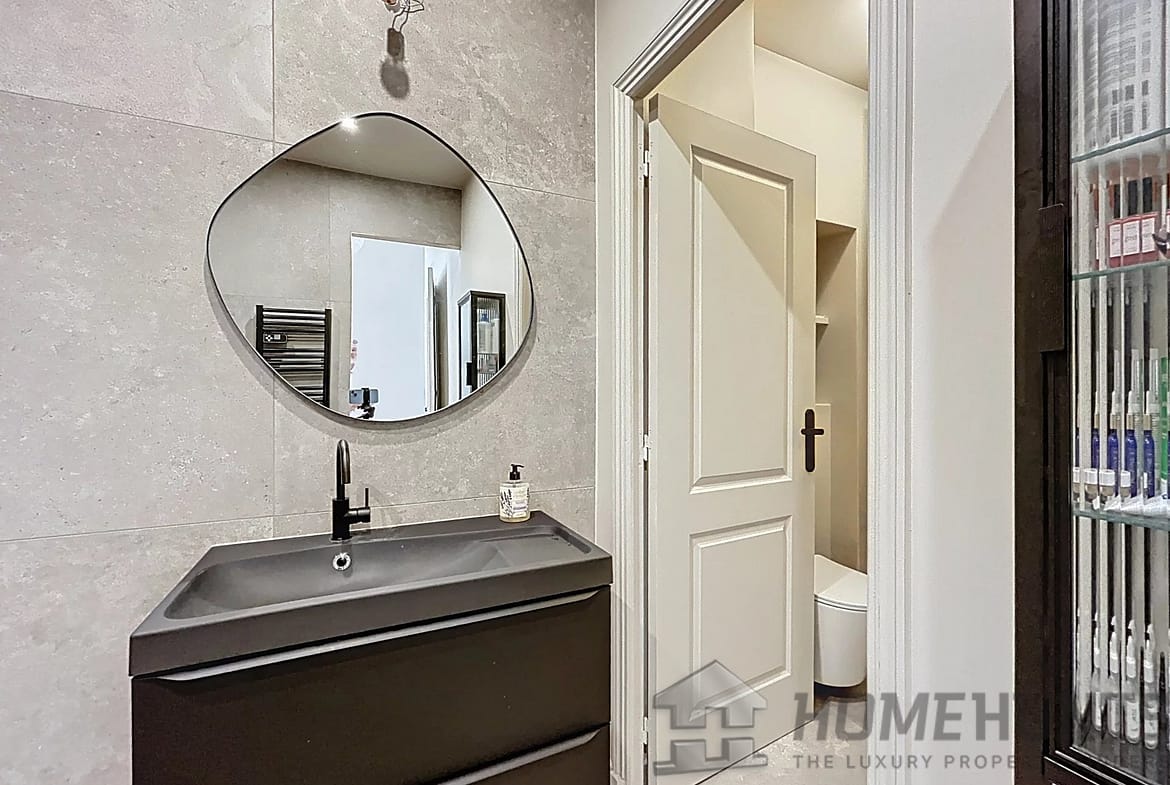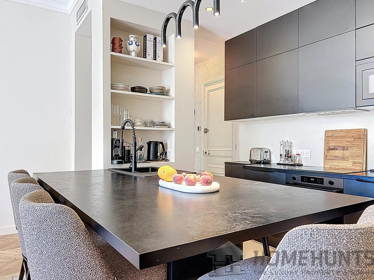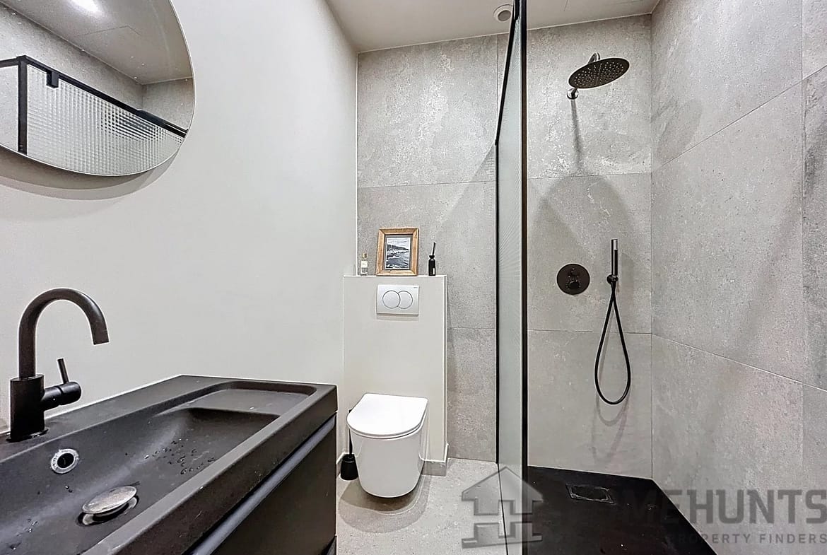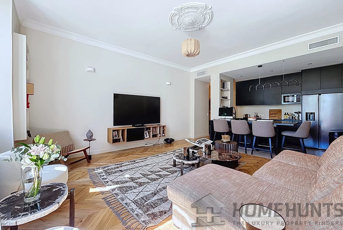 The apartment offers approximately 100 m2 of beautifully renovated living space, combining timeless elegance with modern comfort. A bright and spacious living room with open-plan kitchen creates a warm and inviting atmosphere, while the master suite with bathroom and toilet ensures privacy and comfort. A second bedroom with shower room and toilet completes the layout, ideal for family or guests.