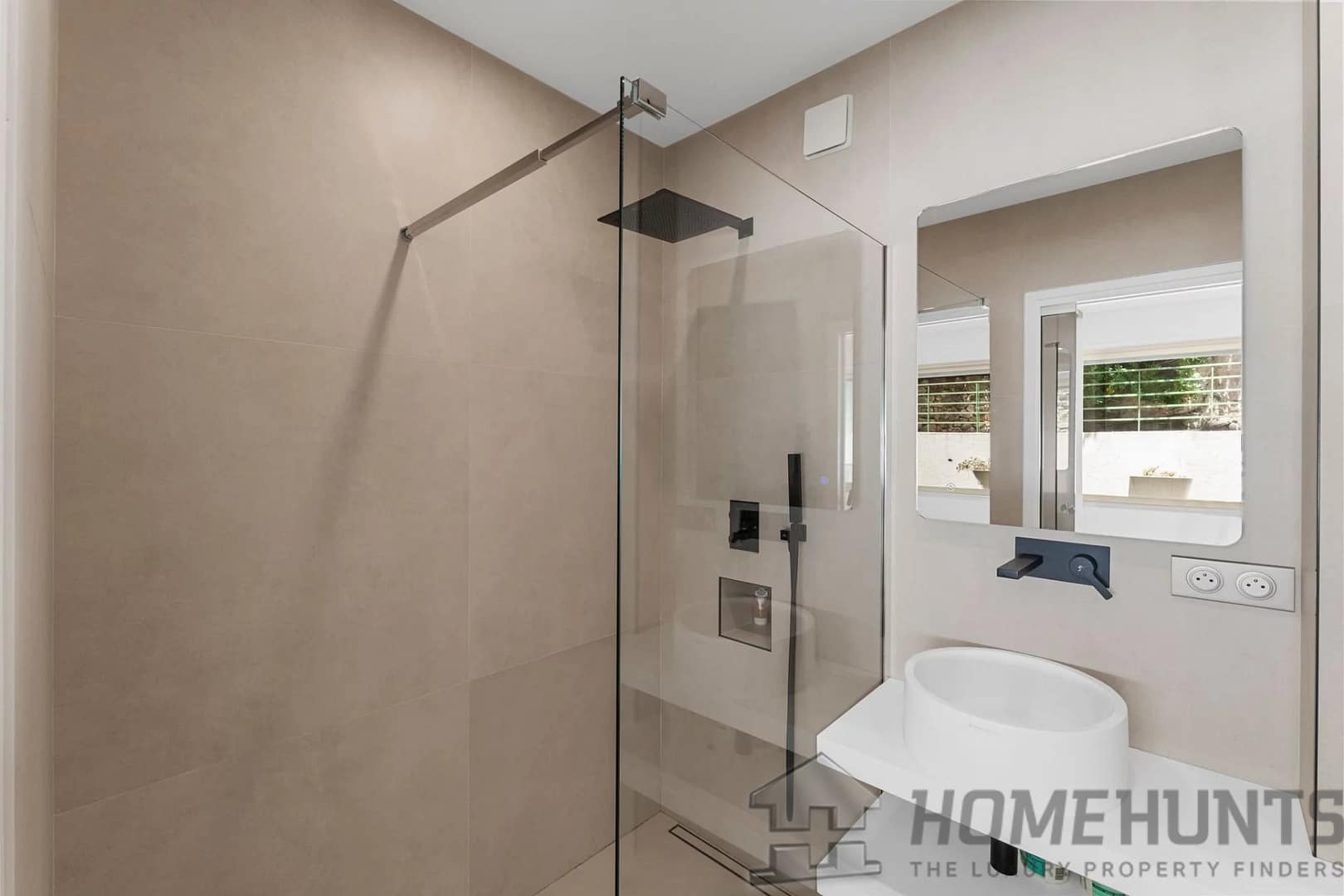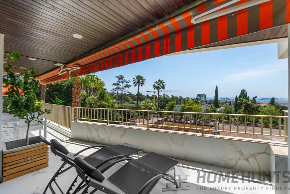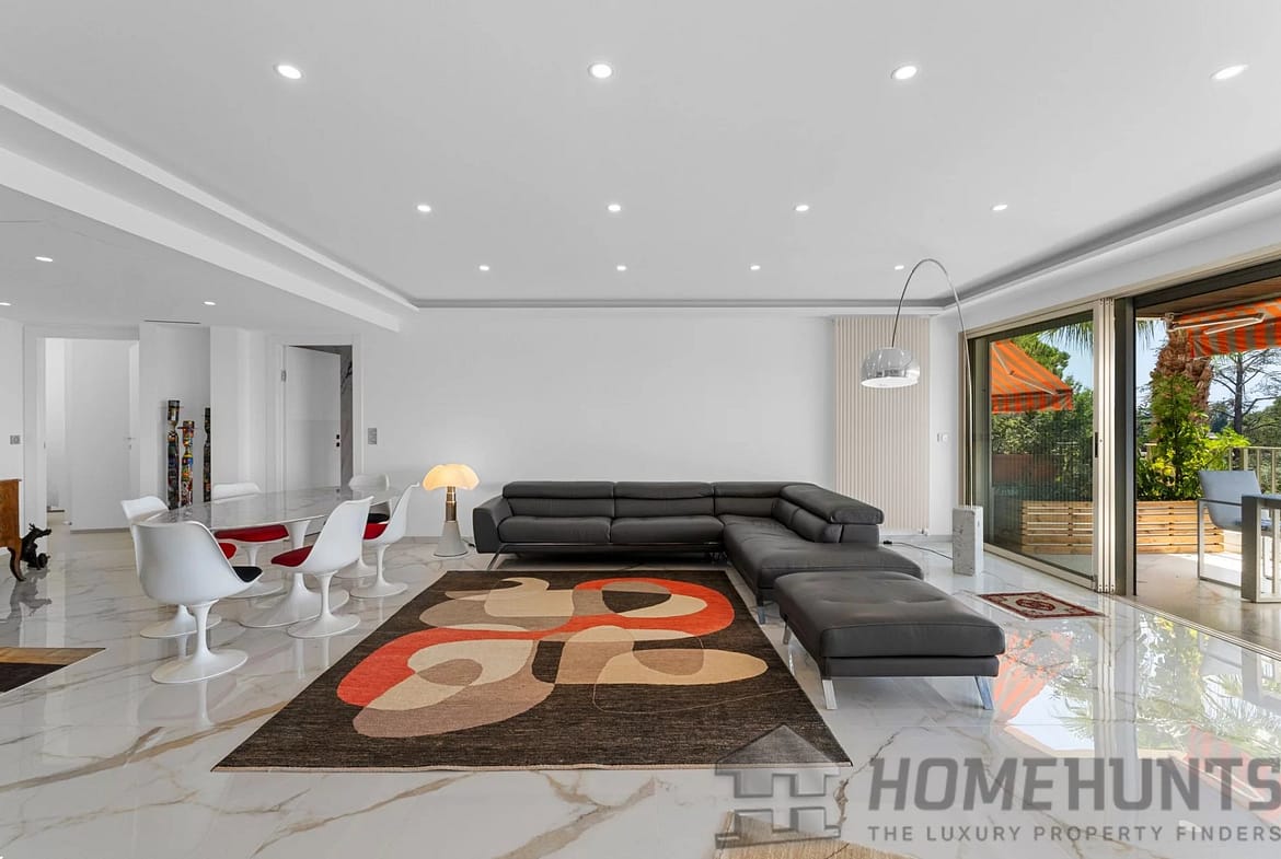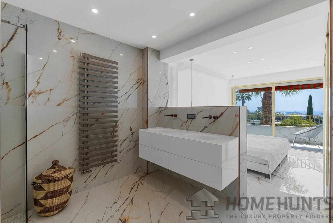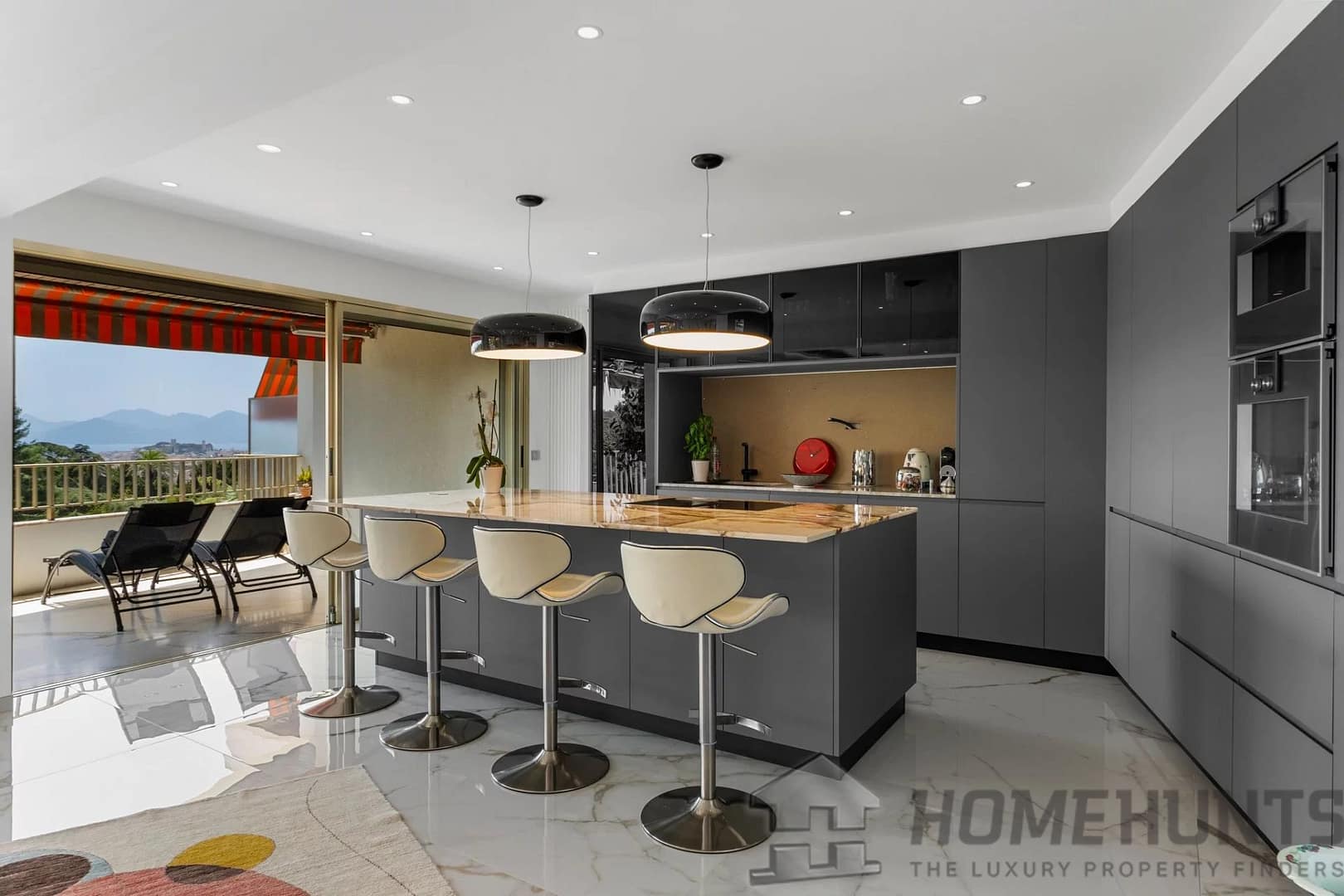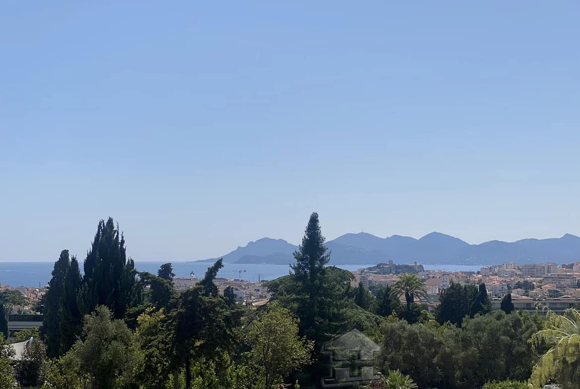 This bright traversing property enjoys a large living room, open to a modern kitchen, all extended by a terrace facing south-west. A panoramic sea view extending from the Lerins Islands to the Esterel.