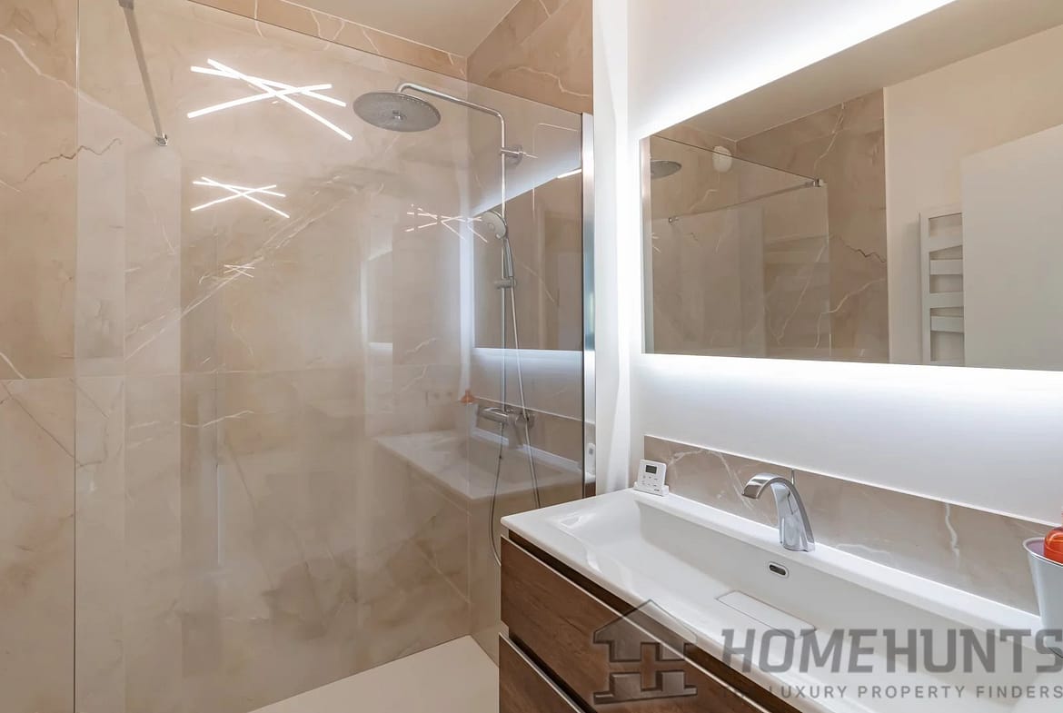 The apartment comprises an entrance hall leading to a spacious 37 m2 living room with two large sliding glass doors, a separate kitchen, a master bedroom with en-suite bathroom and walk-in closet, a second bedroom with its own shower room, and a guest toilet.