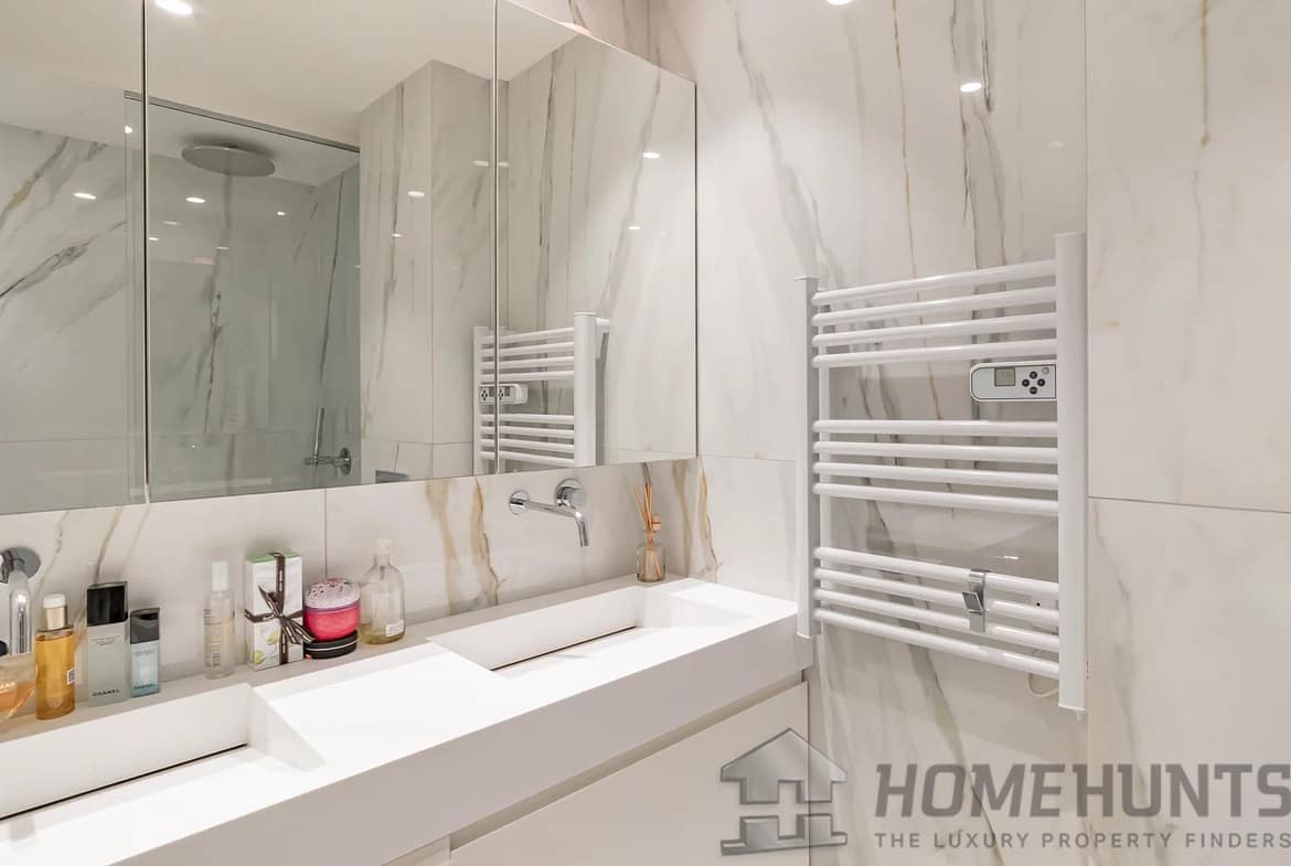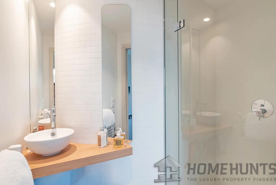 The interior features an elegant entrance hall with bespoke storage, a spacious living room with a fully fitted and equipped contemporary kitchen, and two refined bedrooms, each with its own private shower room.