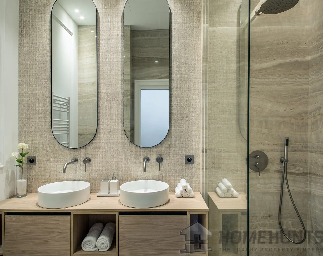 The apartment comprises an entrance hall, guest toilet, living room with fully-equipped open kitchen opening onto a 10 m2 balcony, 4 bedrooms with respective shower rooms, and a laundry area.