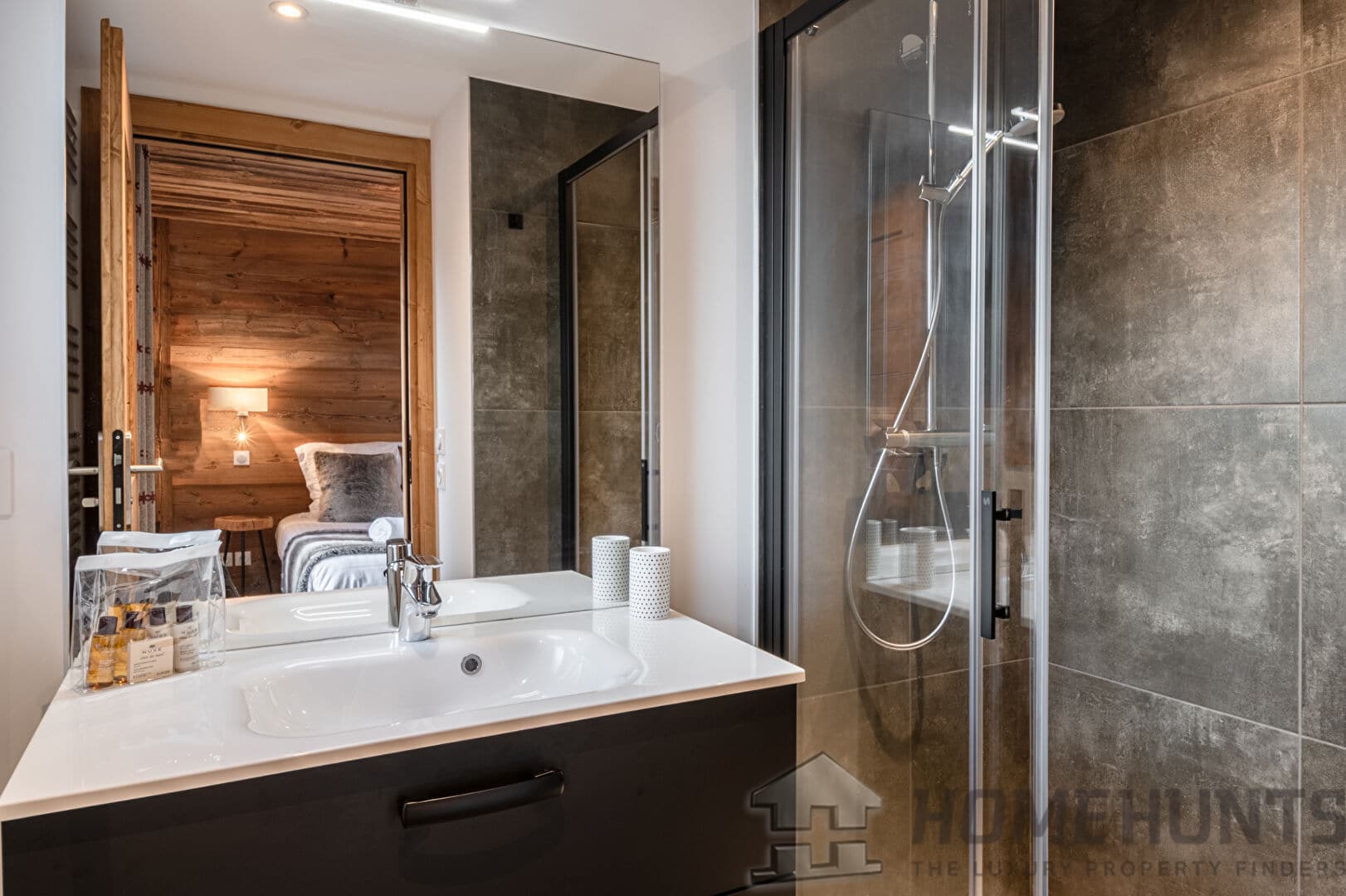 It comprises an entrance hall with storage space, a double bedroom with en-suite bathroom and direct access to a beautiful west-facing terrace with views of Le Brevent, a south-facing living/dining room opening onto a fitted kitchen with access to the terrace, and a separate toilet.