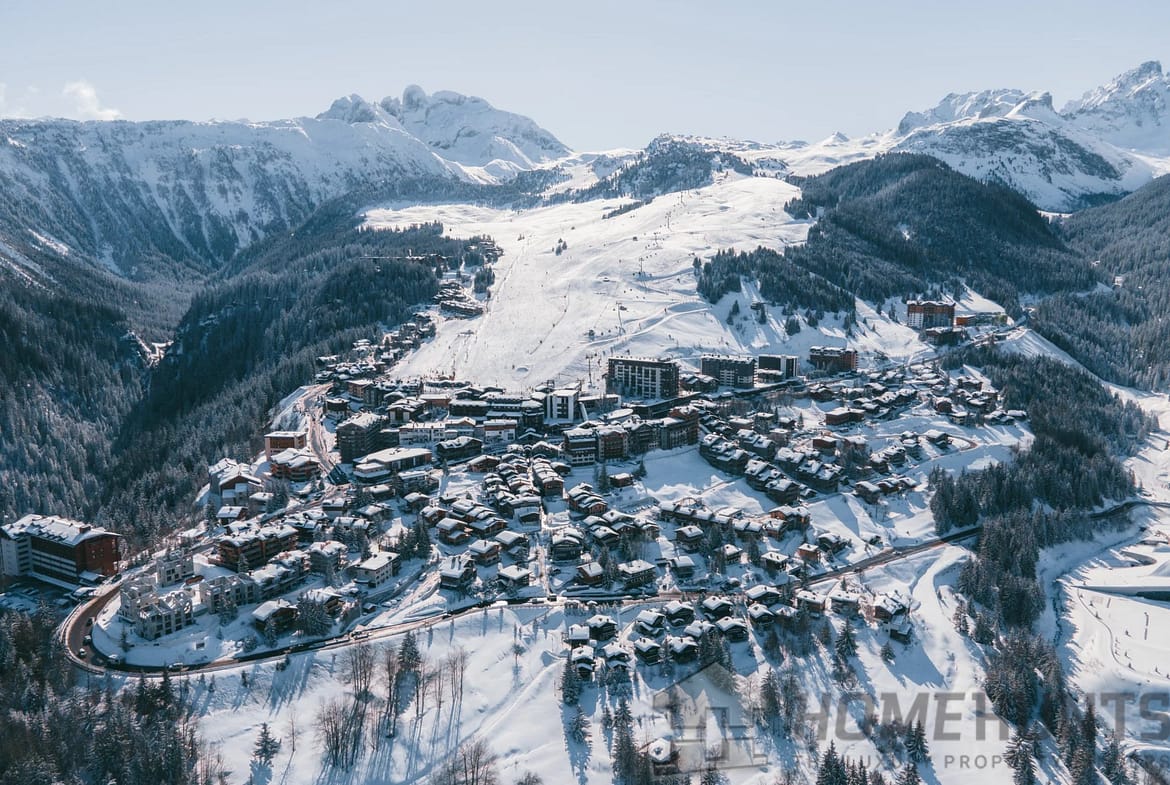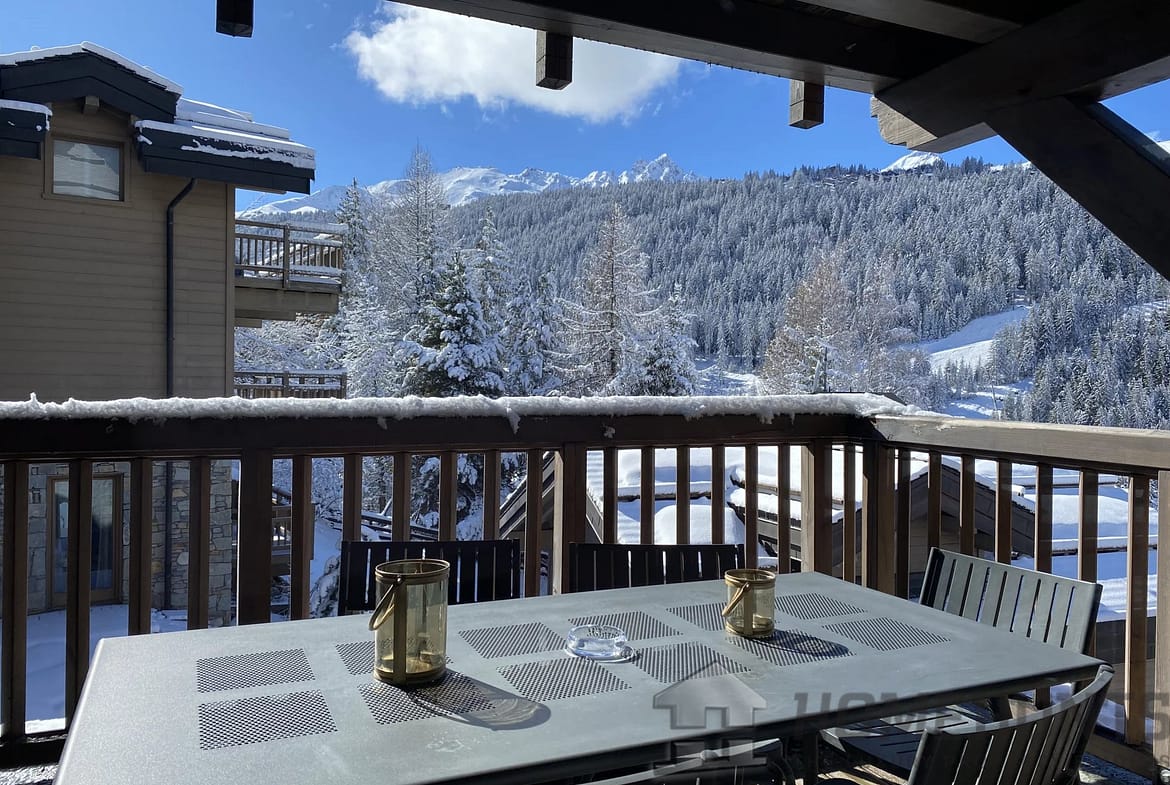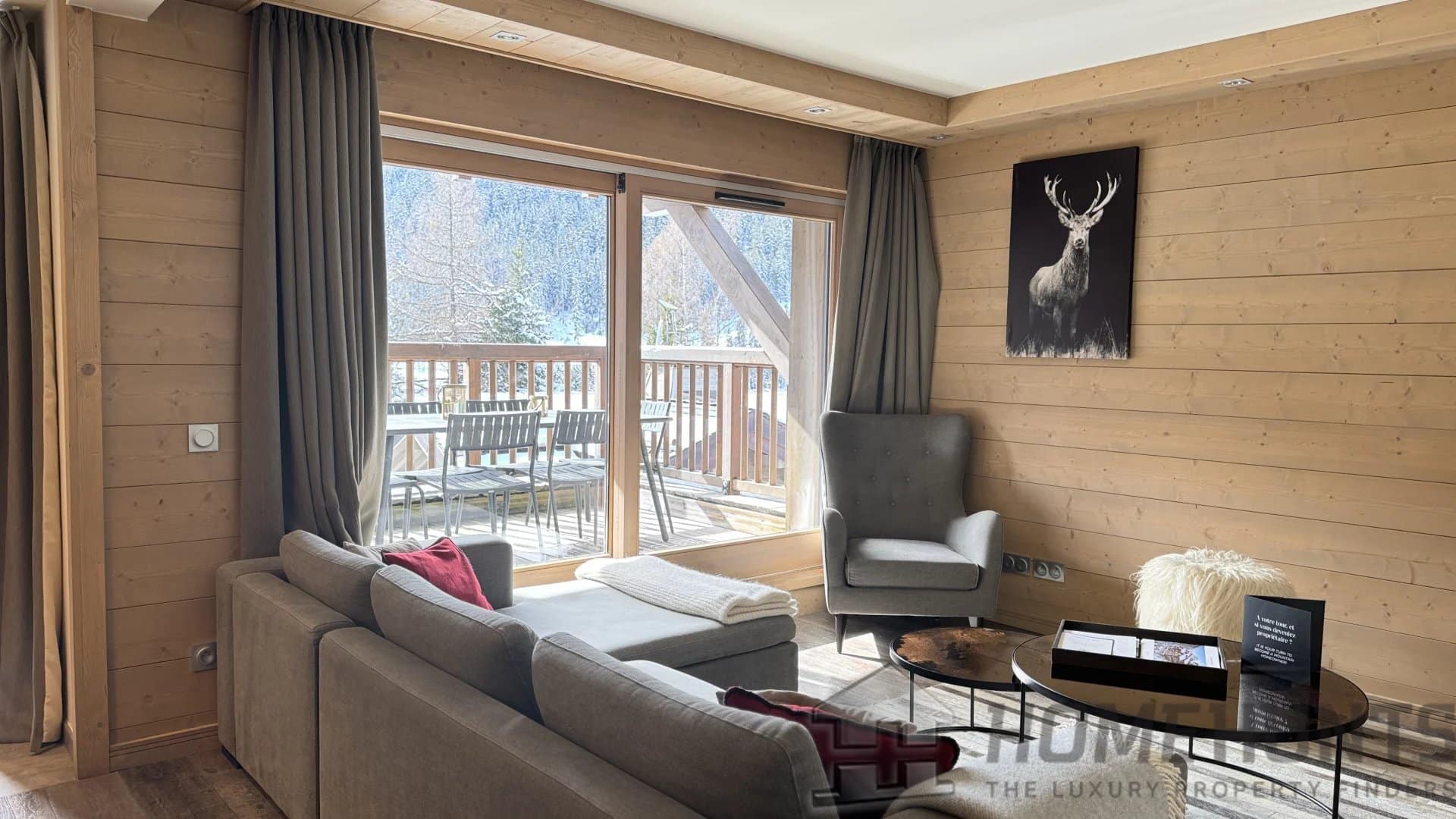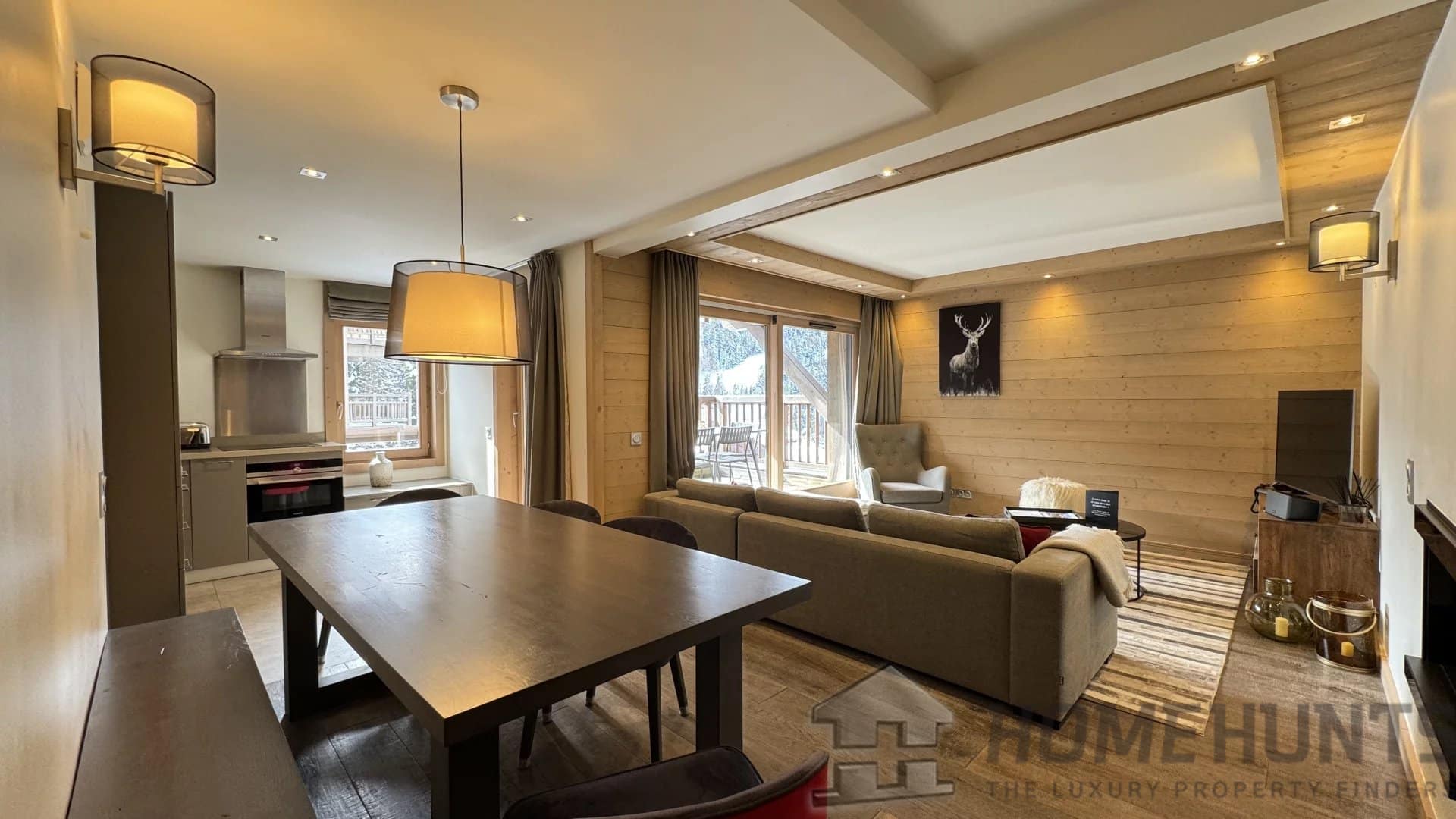 The living room has a sitting area with ethanol stove, a fully-equipped kitchen, a dining room and a balcony with a view of the Saulire.