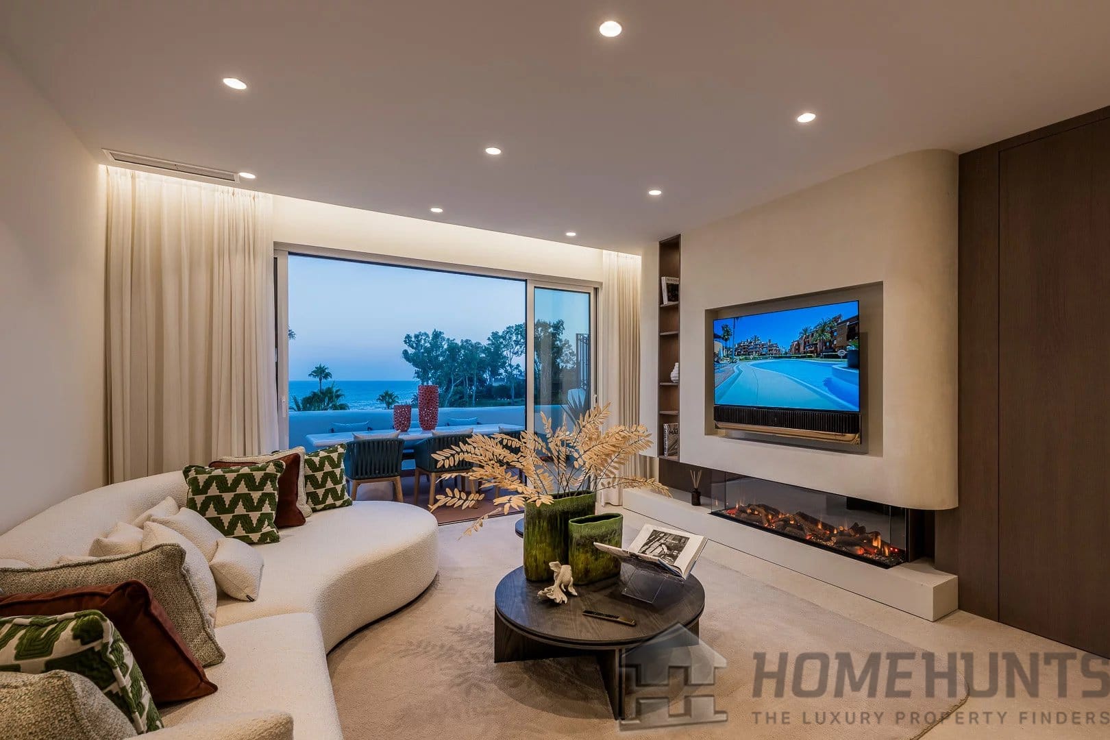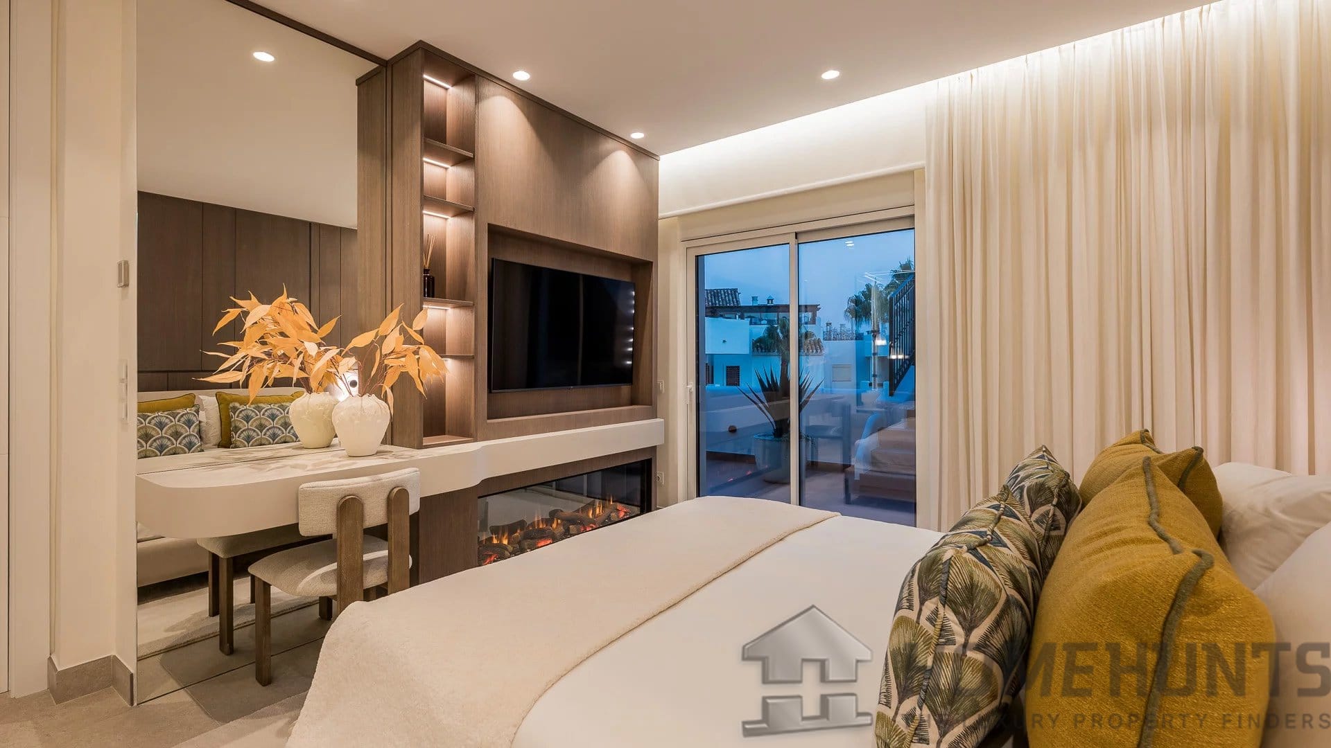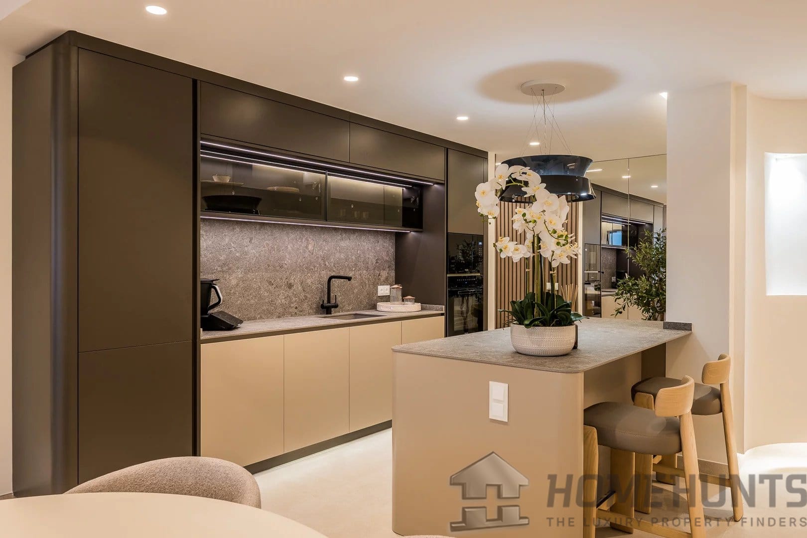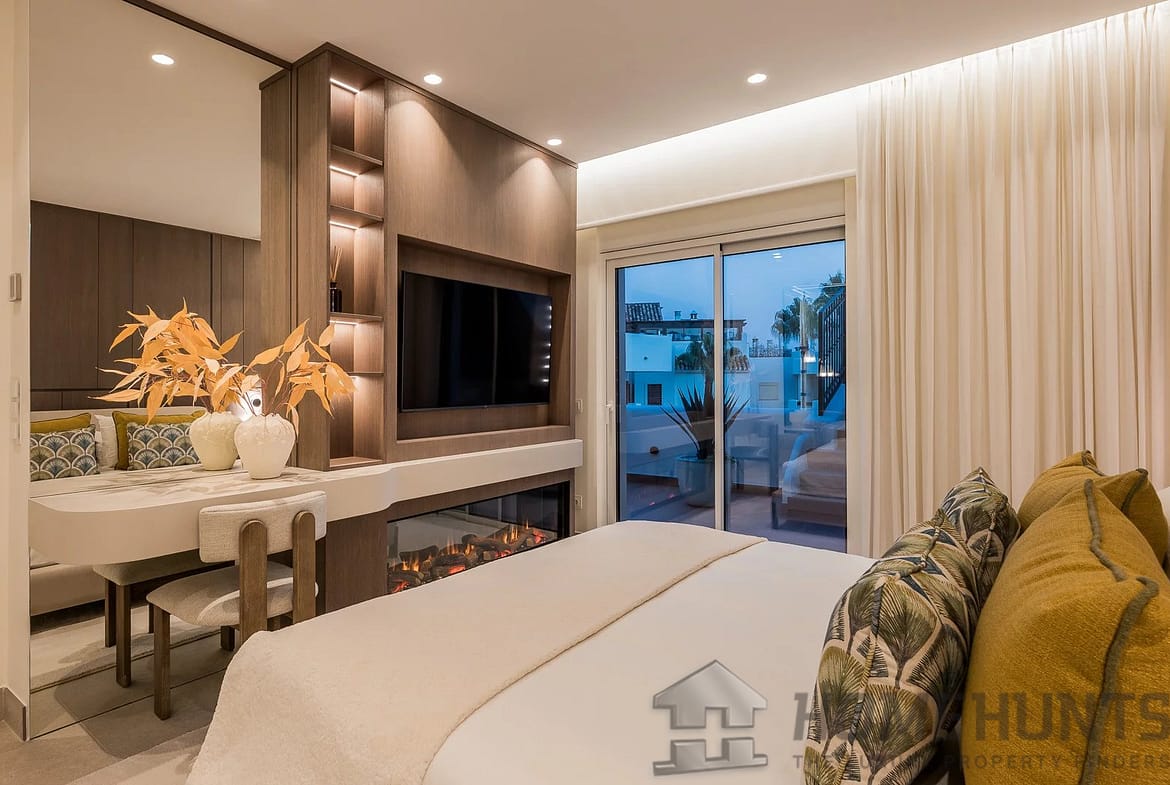 Inside the penthouse, you’ll find an expansive living room and a luxurious master bedroom, both opening onto spectacular, views of the Mediterranean Sea. An elegant electric fireplace adds a touch of modern sophistication, while large windows flood the interiors with natural light.