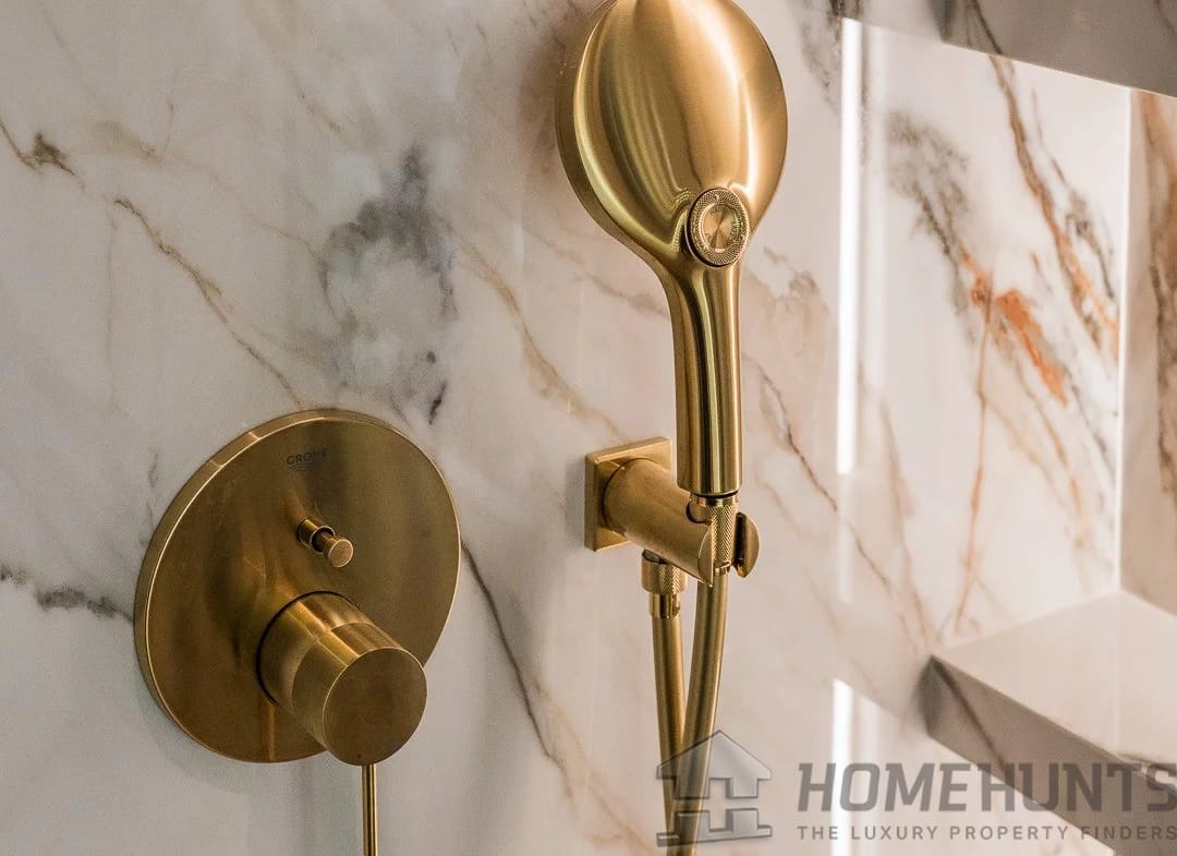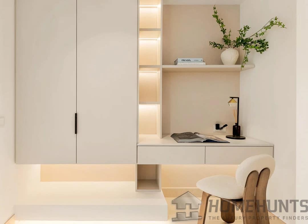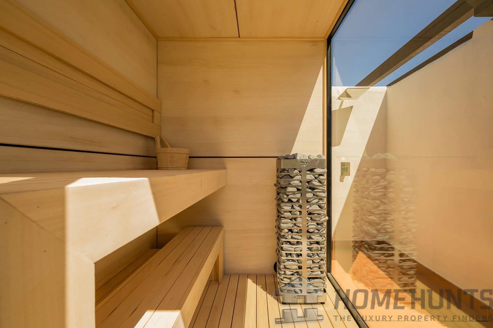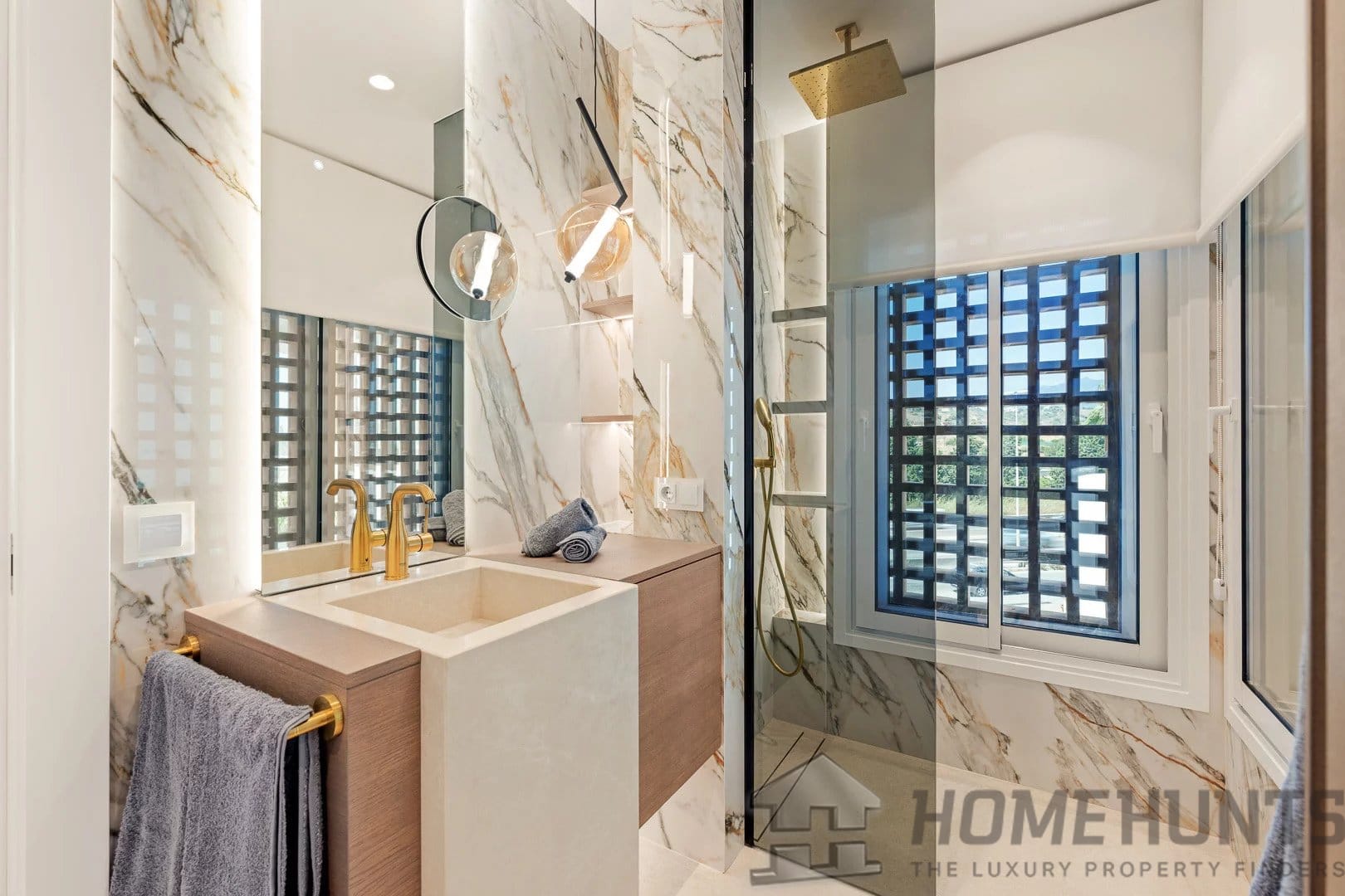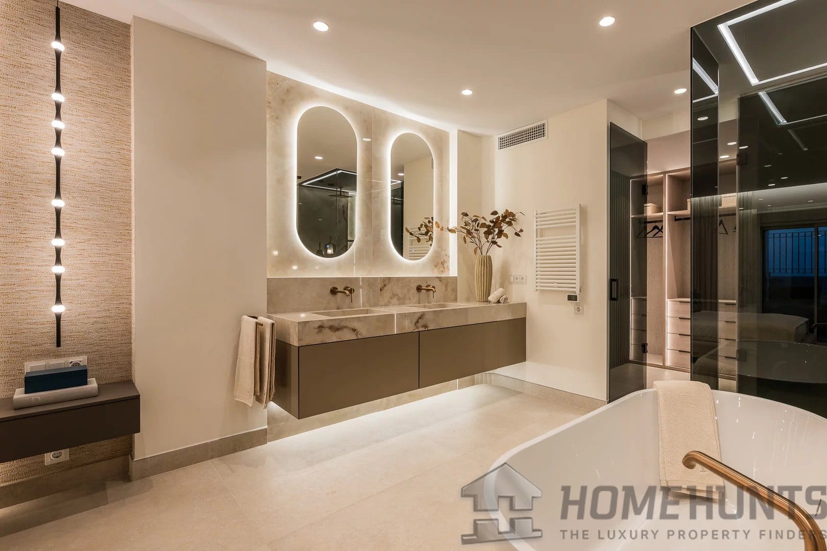 Inside the penthouse, you’ll find an expansive living room and a luxurious master bedroom, both opening onto spectacular, views of the Mediterranean Sea. An elegant electric fireplace adds a touch of modern sophistication, while large windows flood the interiors with natural light.