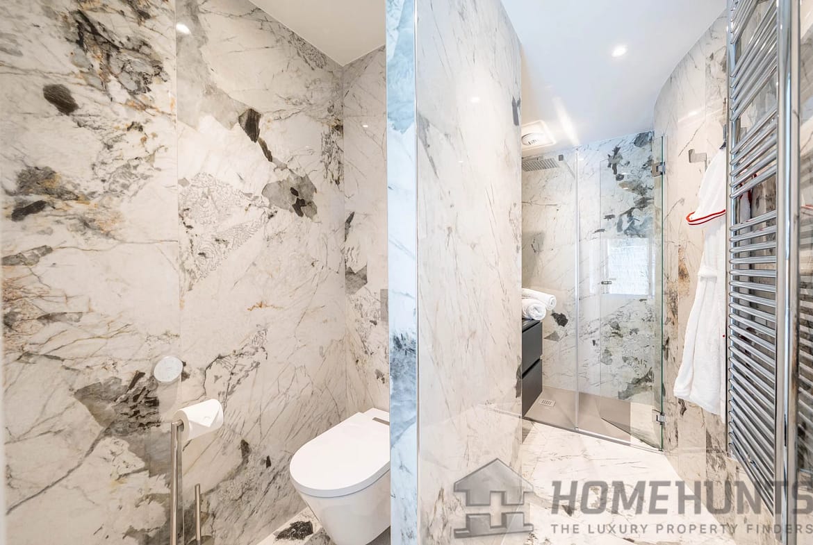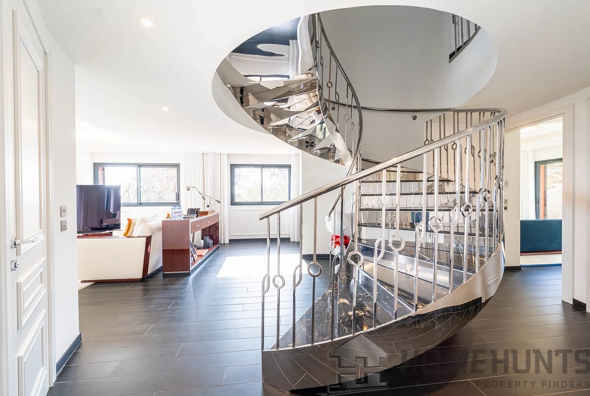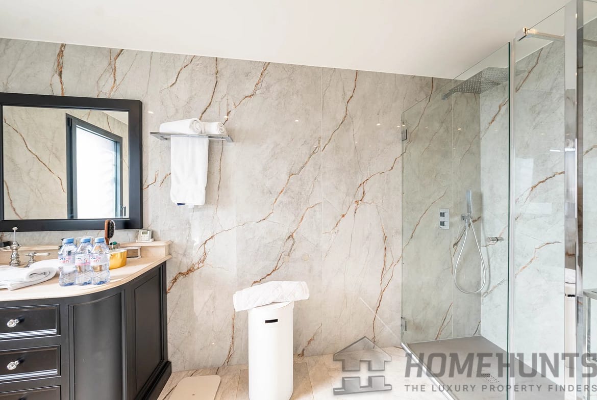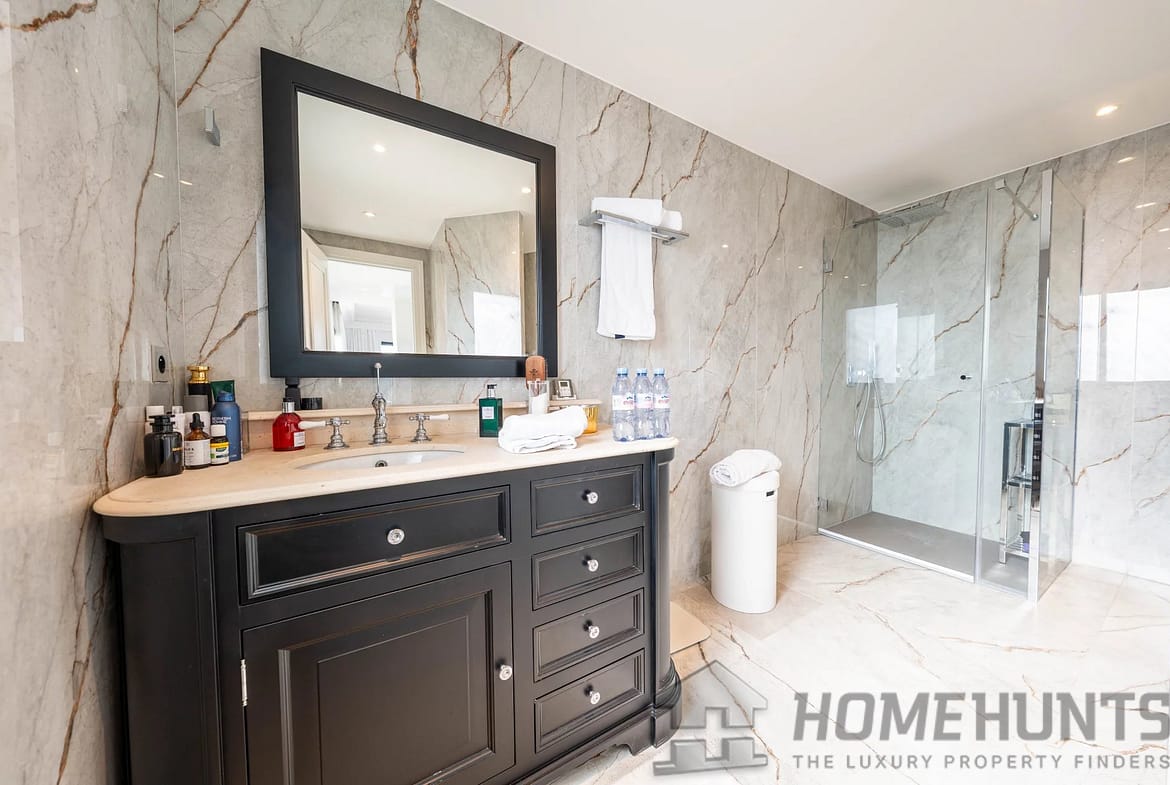 Upon entering, you are greeted by a gracious and light-filled living area, flowing seamlessly into a designer open kitchen with a stylish dining space—perfect for hosting in elegant Riviera fashion. The property boasts four private bedrooms, each with its own en-suite bathroom, in addition to two dressing rooms and a guest WC, offering a layout that balances luxury and practicality for both family life and entertaining.