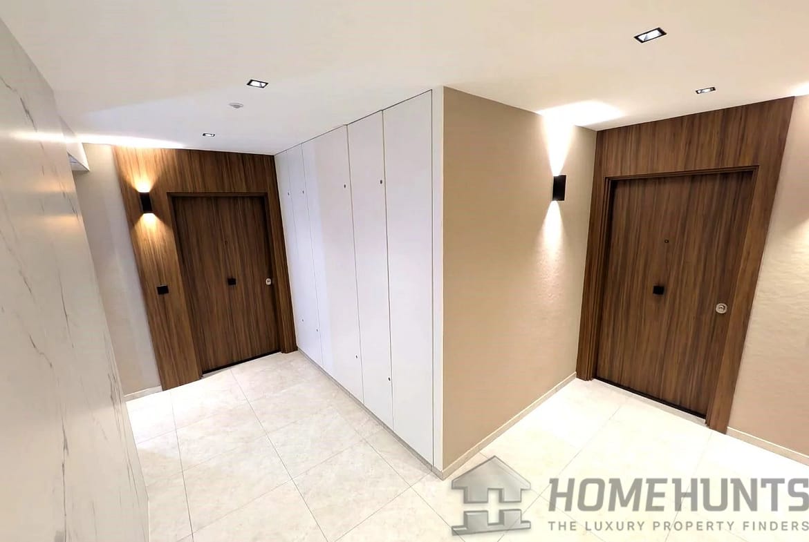 With a living area of 102 m2, this property features an elegant entrance hall, a vast living room with open kitchen, three bedrooms, two bathrooms, guest toilet, dressing room, 26 m2 loggia, and a magnificent 77 m2 private rooftop solarium offering breathtaking views.