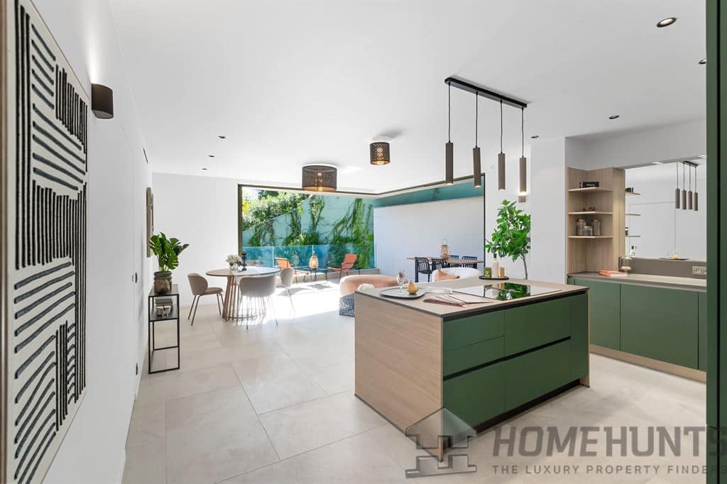 Village amenities are within easy reach, Cannes – beaches are 20 minutes away, Nice International Airport 30 minutes, and the Terre Blanche Golf just 15 minutes. A cellar, parking space, or closed garage, with double garage option, can be acquired in addition. The kitchen is included; furniture shown is illustrative.