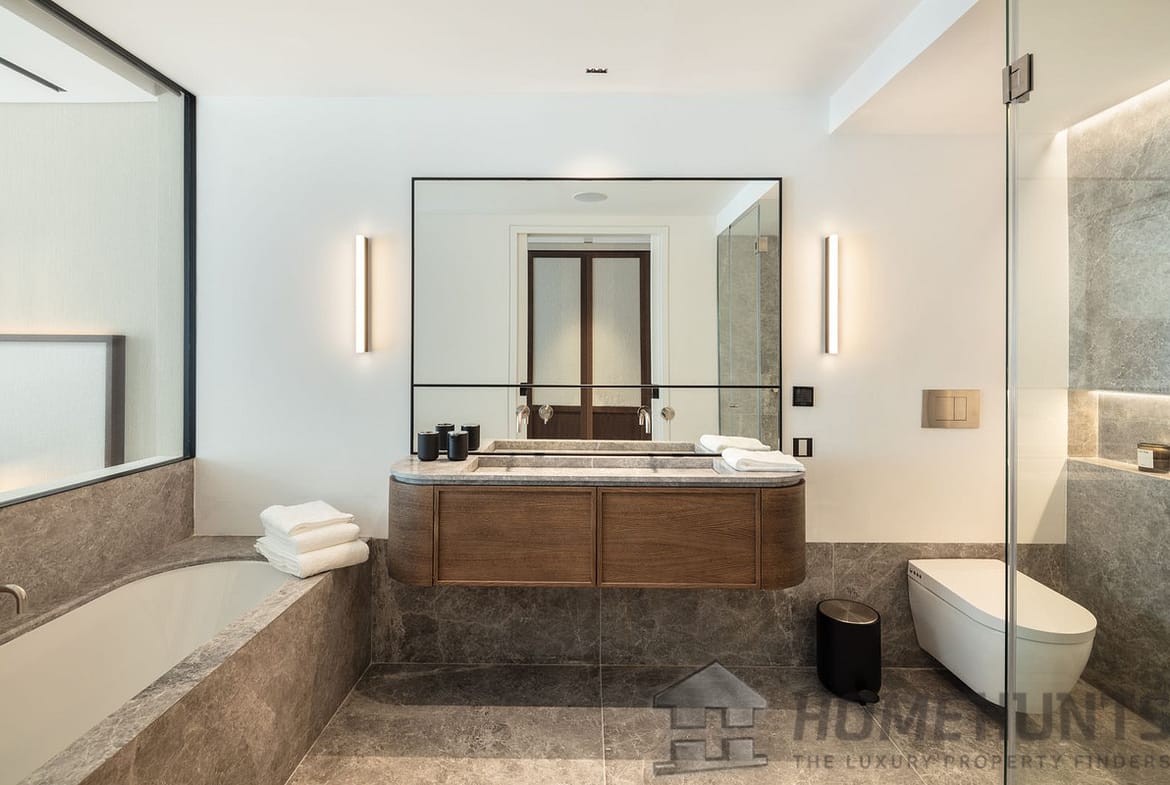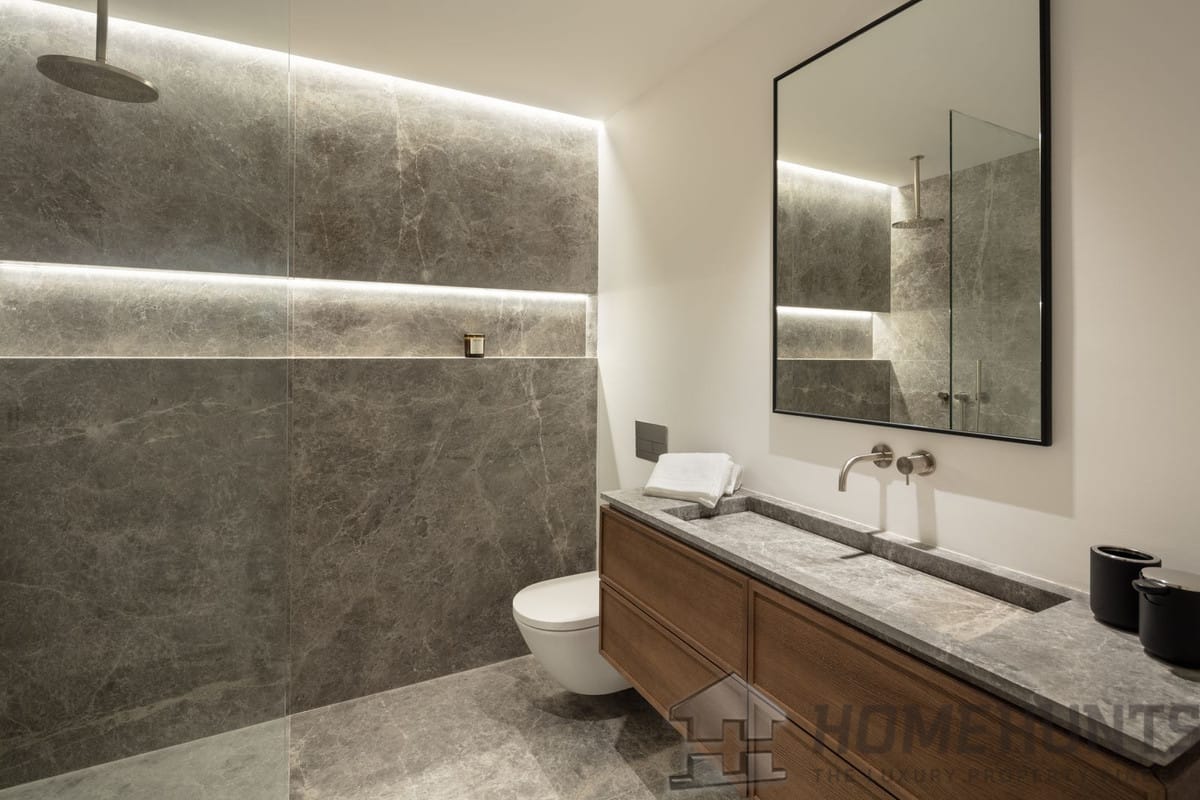 All bedrooms are well appointed and decorated with the finest materials and furnishings, while sticking to the interior design colour pallet. The bedrooms also have their own en-suite bathroom. The master bedroom is an elegant and cosy space, the ideal place to relax and unwind. A privacy glass window separates the bedroom from the bathroom where one can appreciate the stunning grey stone used for the double vanity, shower and bathtub.