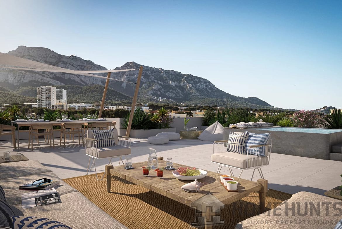 The apartment’s 44 m2 living room opens seamlessly onto the expansive terrace, designed for outdoor living at its finest. With a dedicated lounge area, pergola, and a private plunge pool, this outdoor haven offers sweeping views over the surrounding hills and a glimpse of the sea, all while ensuring total privacy in a peaceful setting.