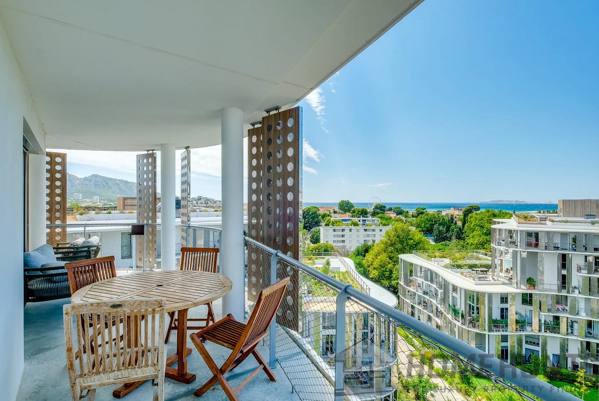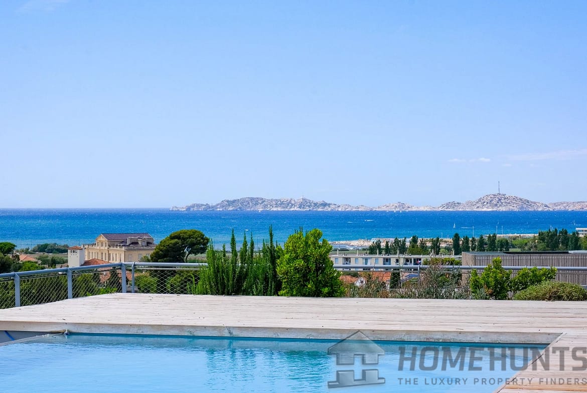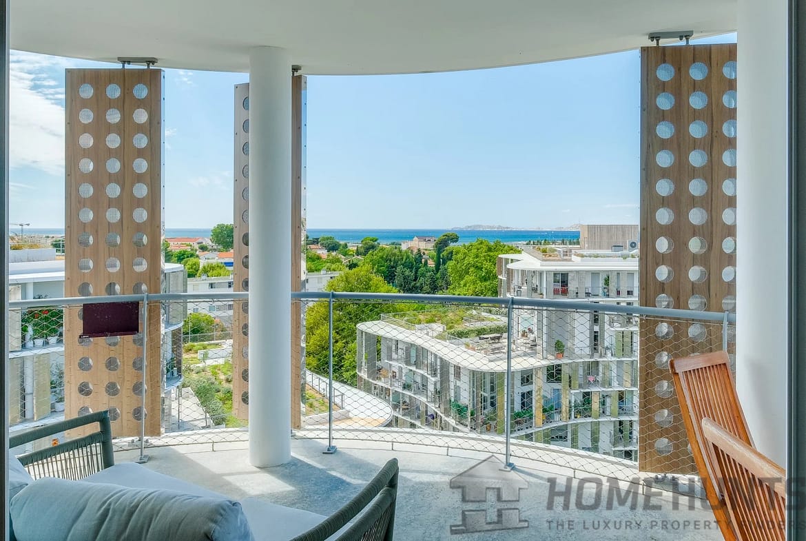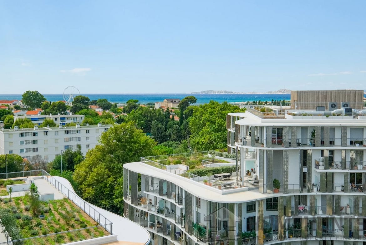 The residence includes a rooftop with swimming pool, exclusively reserved for residents. From this unique setting, the panoramic view stretches over the sea, the hills, Notre-Dame de la Garde, and the entire city, offering an idyllic backdrop to enjoy stunning sunsets.