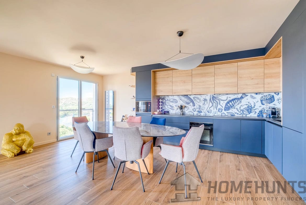 The apartment opens onto an entrance with cloakroom, followed by a hallway leading to a vast 55 m2 living area. This bright space combines a living room, dining area, and open-plan kitchen. It extends onto a large 26 m2 terrace facing south and west, with an unobstructed view of the sea and hills.
