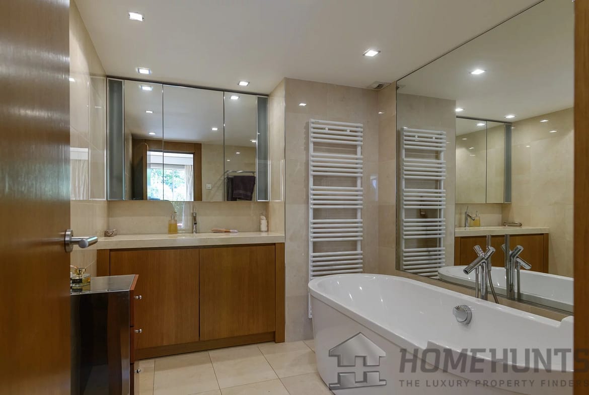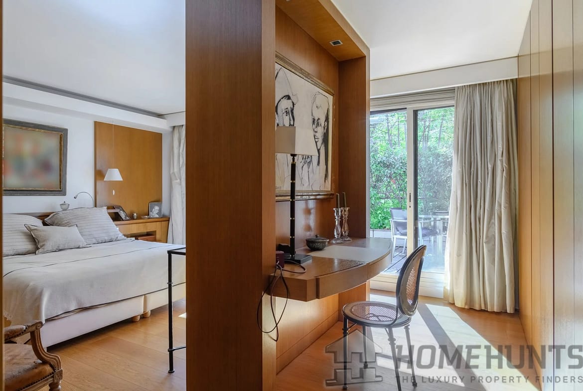 The apartment’s night quarters host a sublime master suite designed for comfort and privacy. A double corridor of bespoke dressing rooms leads into the luminous bedroom, which also benefits from direct terrace access. The suite includes a full bathroom, an additional shower room, and separate toilets.