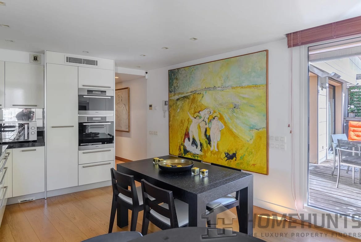 A long hallway, cleverly optimized with custom integrated storage, leads to a generous 20 m2 dining kitchen fitted with top-quality double appliances. Opening onto a sun-drenched, peaceful terrace, this convivial space is perfect for alfresco dining and private moments of relaxation.