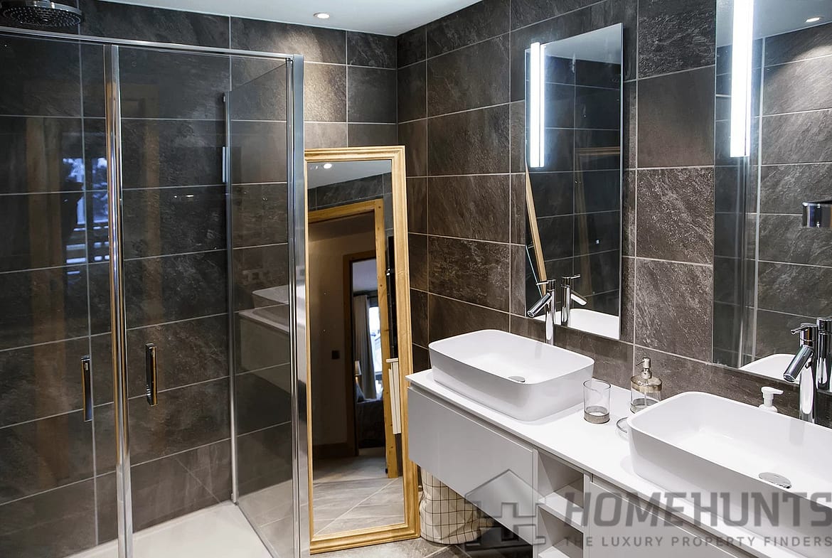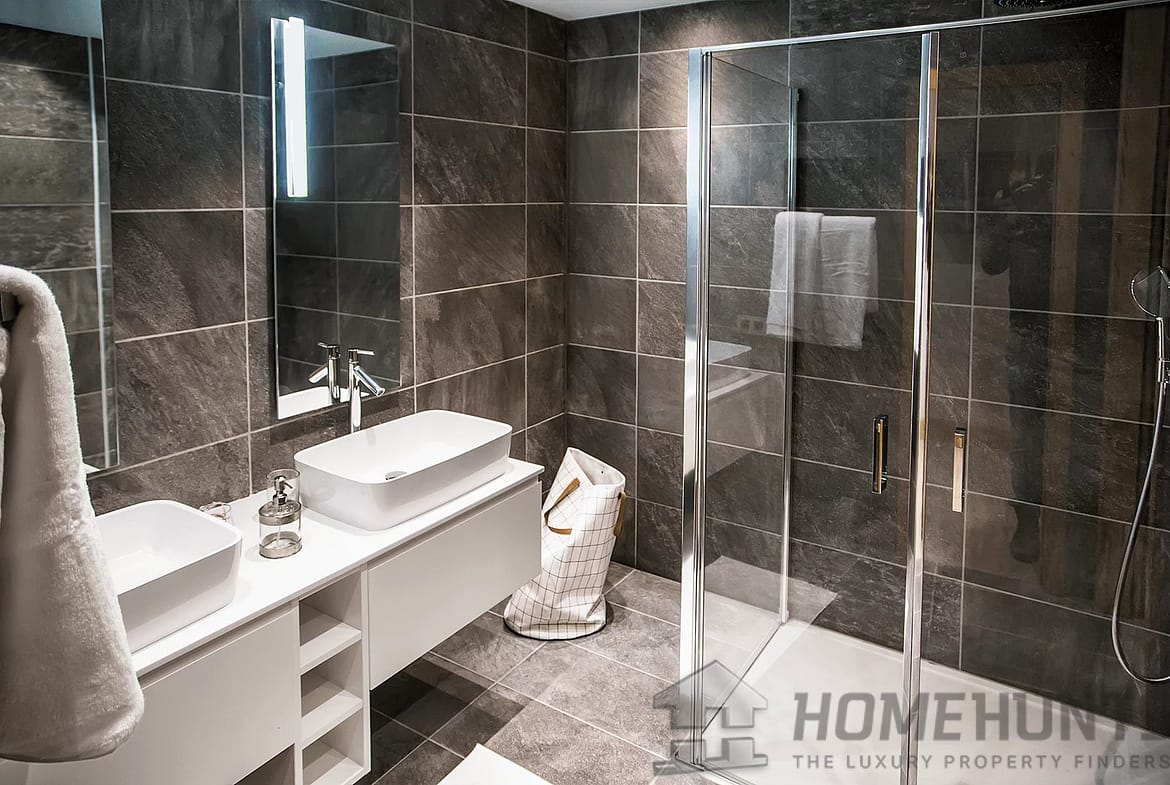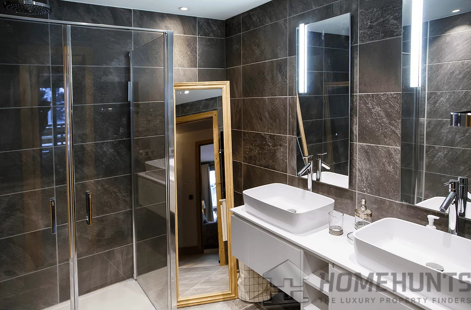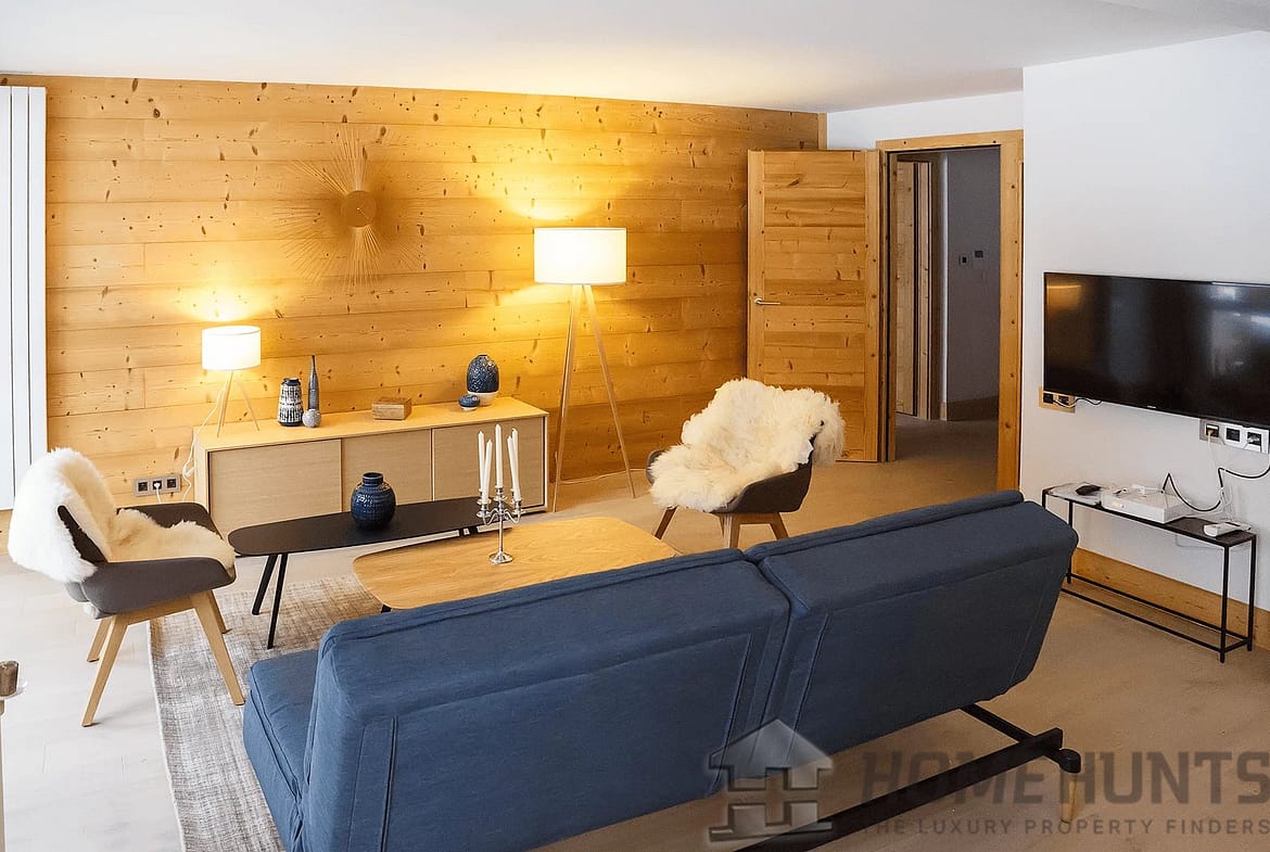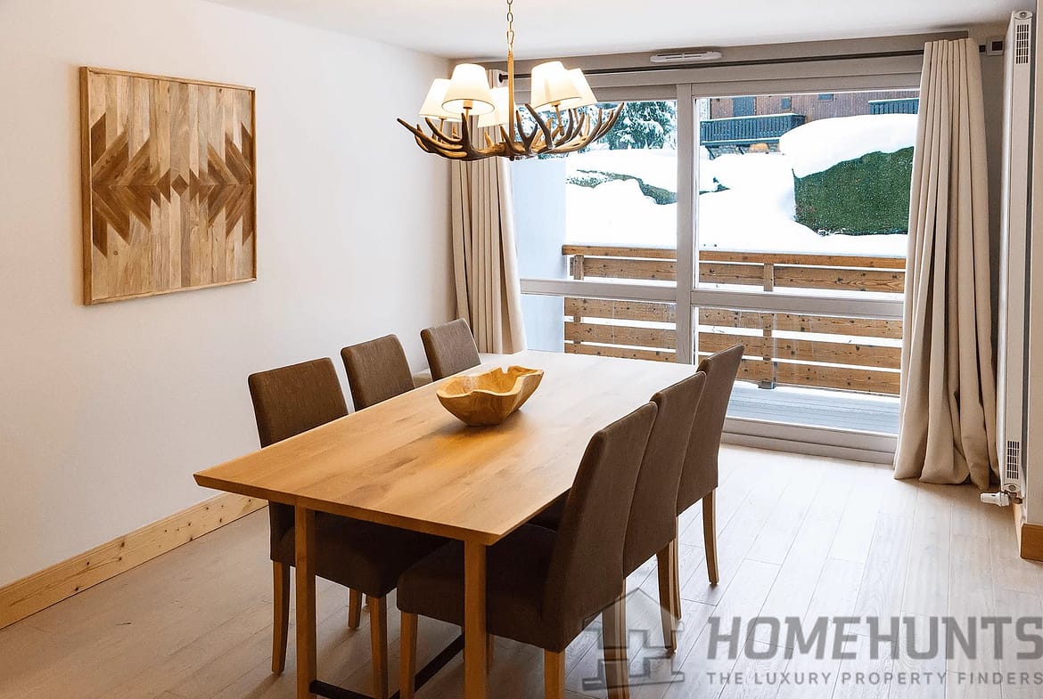 Megeve apartment, 98.57 m2 which consists of a large living/dining room open onto a fully equipped kitchen, two en-suite bedrooms with their own dressing room, walk-in shower room and toilets. Guest toilets with wash basin is available from the entrance.
