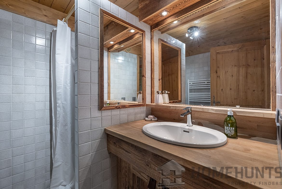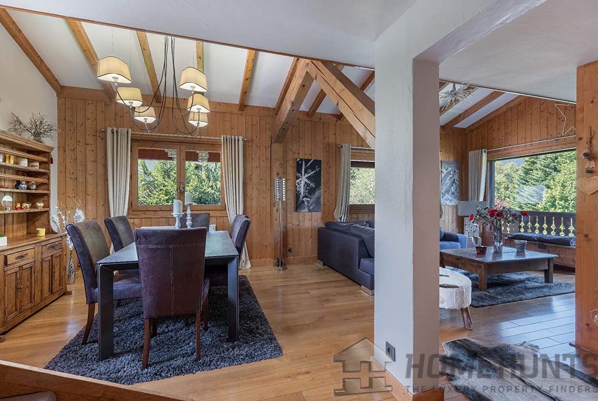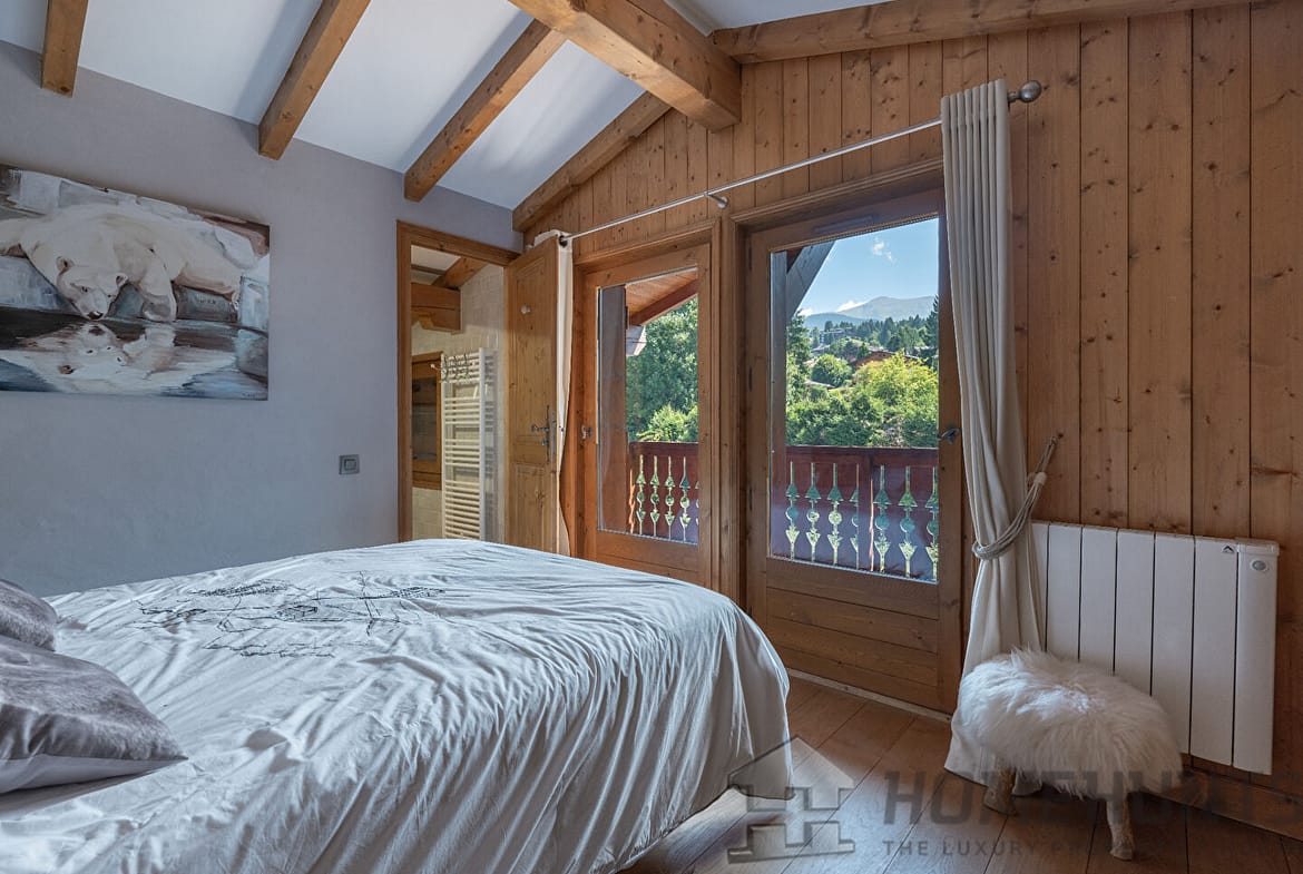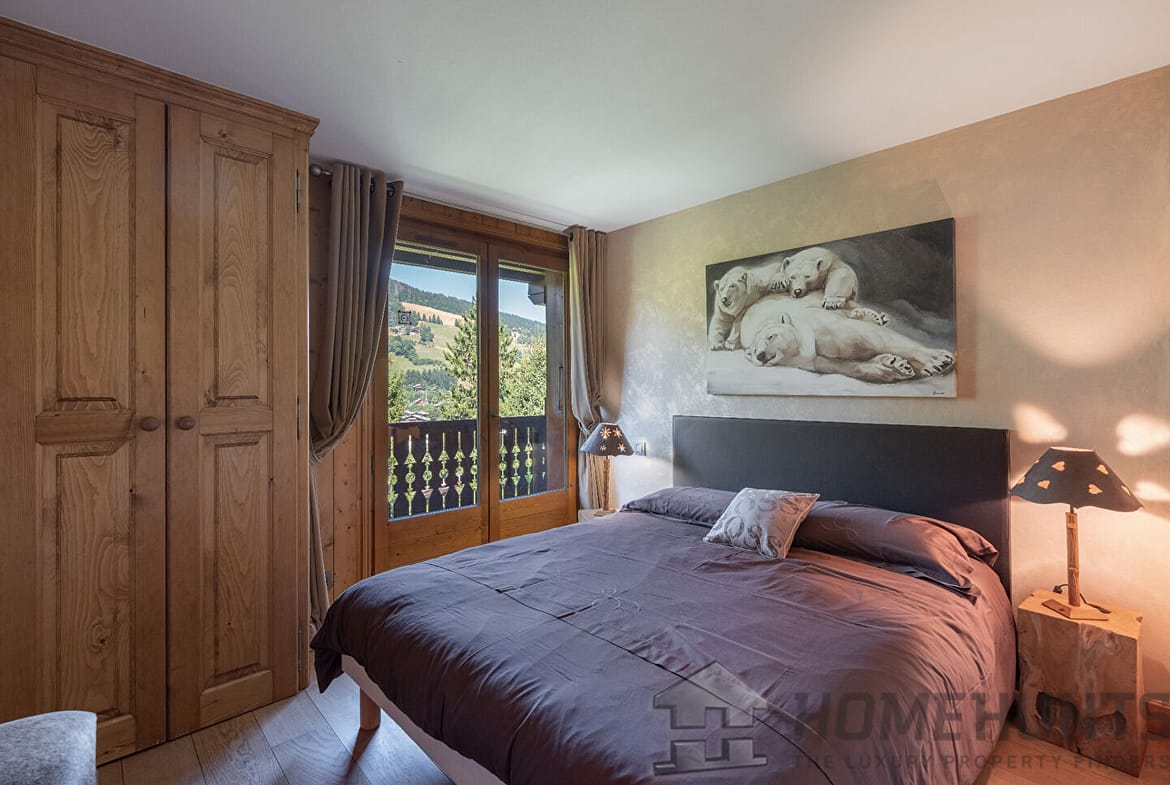 The living room, featuring a fireplace, opens onto a south-facing balcony—an ideal spot to enjoy the open views and Megève’s unique atmosphere. A separate, fully equipped kitchen completes this welcoming living space.