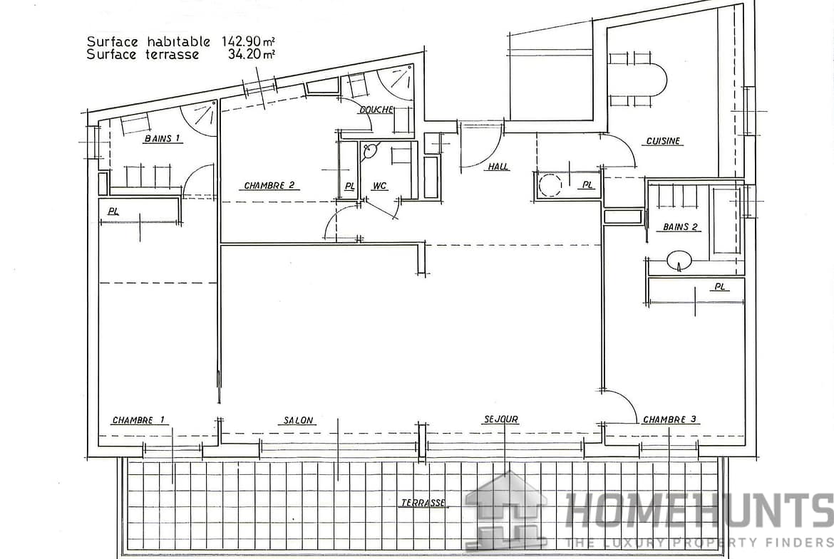 Facing south, the apartment benefits from all day sunlight, with a vast living room / dining room that open up to a large terrace, a separate kitchen, 3 bedrooms, 2 full bathrooms and a separate guest bath.