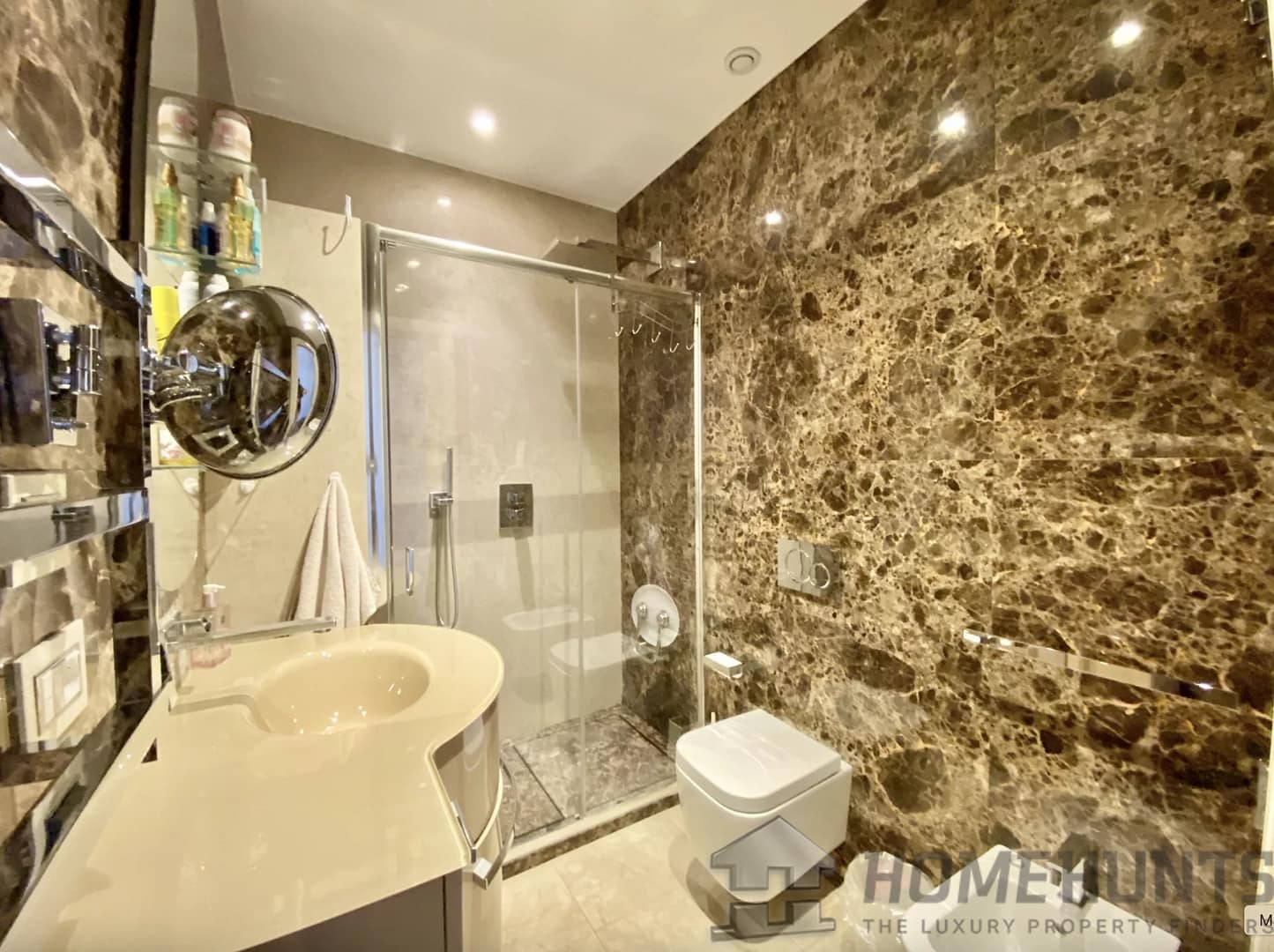 The layout includes an entrance hall, a spacious living room with fully equipped open-plan kitchen, three bedrooms, one bathroom, two shower rooms and a separate WC. Six built-in closets provide ample storage.