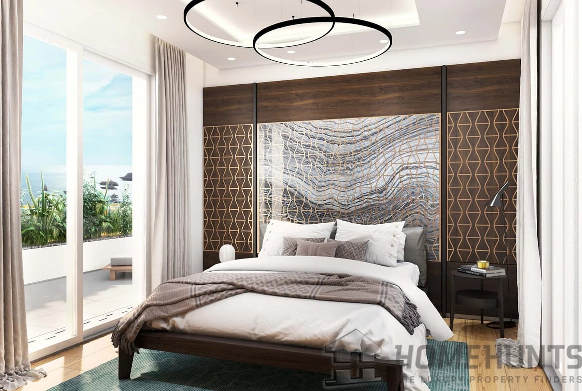 The property reveals a vast and bright living area with a cosy lounge area and a dining area that faces the modern open plan kitchen, separated by a splendid marbled central island with a snack counter. It is extended by a spacious landscaped terrace accommodating a lounge and a dining area, gazing out at the omnipresent sea, promising residents blessed peace and quiet.