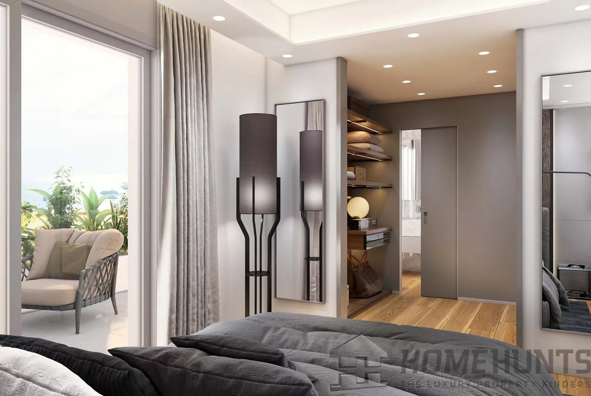 A modern masterpiece staircase, made of wood and glass, leads to the upper floor sheltering the very private Master level, boasting a spectacular bedroom, a marvelous marbled en-suite bathroom with large shower, an en-suite dressing area, a separate room for toilet and bidet and a expansive private terrace as a relaxation area in front of the Mediterranean.