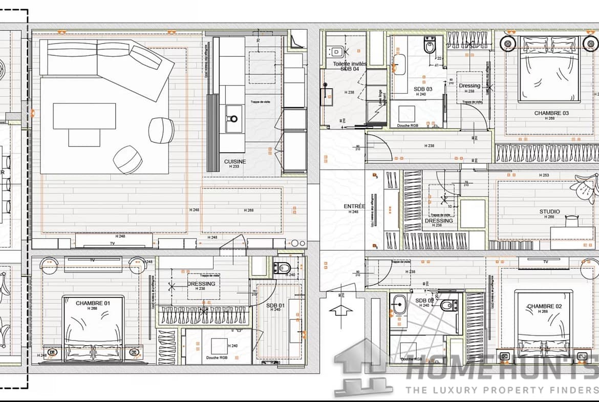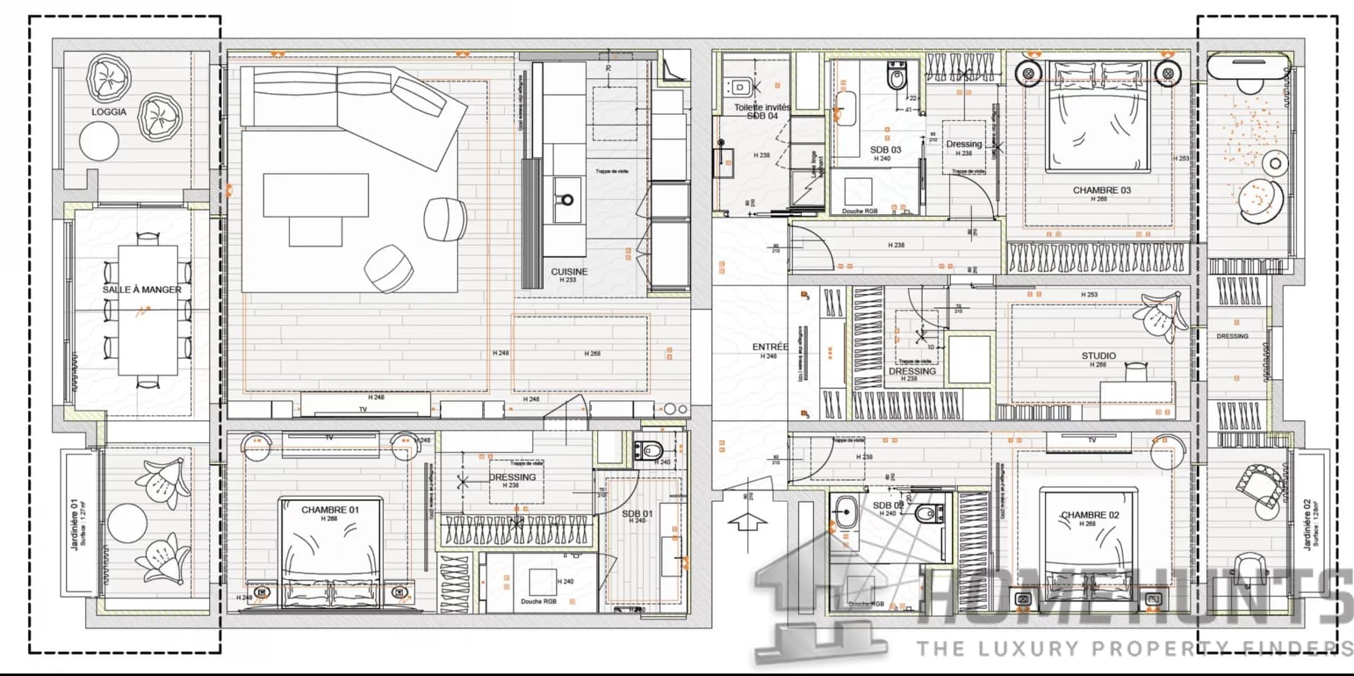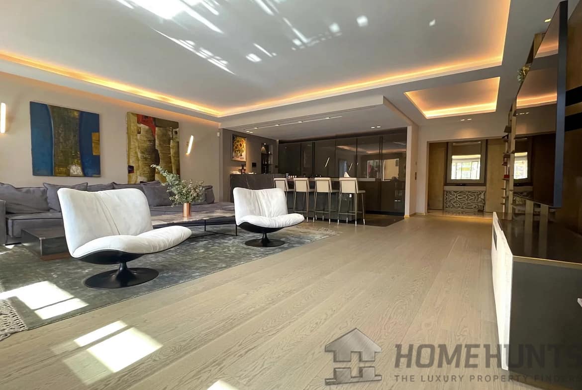 The apartment is very bright, benefiting from sunlight throughout the day and composed of an entrance hall with guest toilet, a spacious living room, a dining room, with open kitchen, four generous sized bedrooms each with an en-suite bathroom and ample storage space.