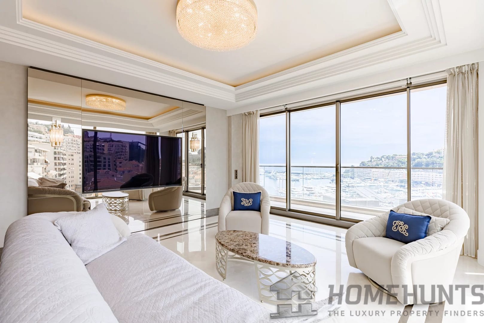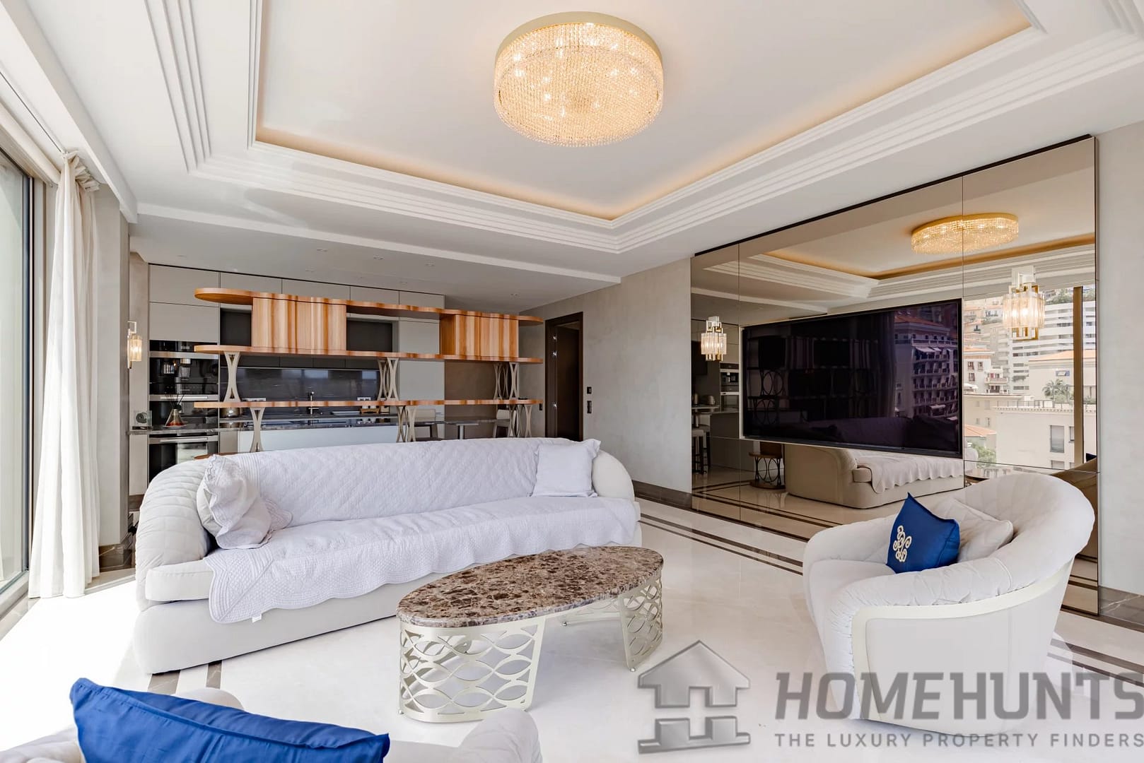 This 3-bedroom apartment, measuring 150 m2, is situated on the upper floor, offering panoramic views over Monaco. It features high-end finishes, a fitted kitchen, and a parking space.