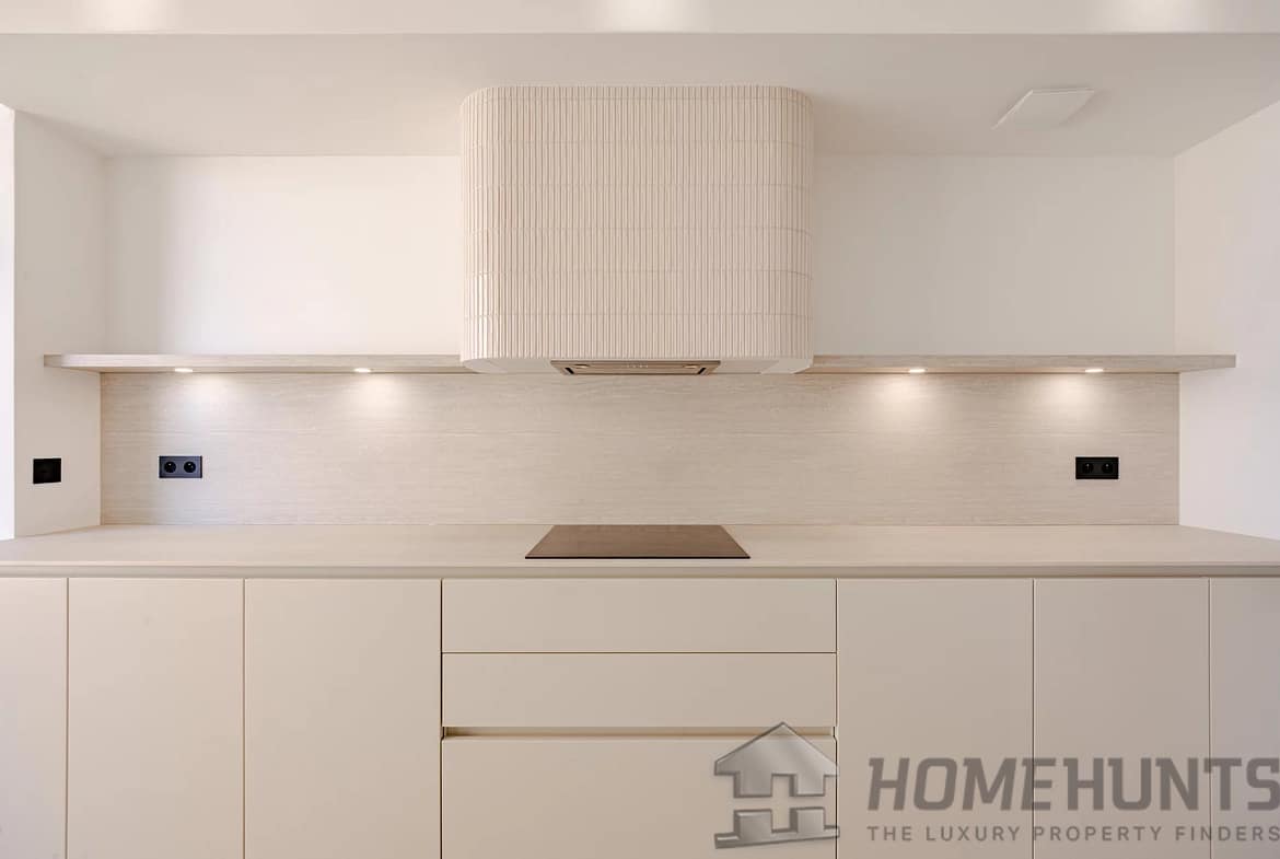 The bright and airy living area, with high ceilings and pleasant open views extending to the sea, features a refined renovation in soft, contemporary tones. The layout includes an entrance hall with built-in storage, a spacious double living/dining room with a fully equipped open-plan kitchen, all opening onto a small balcony with sea view.