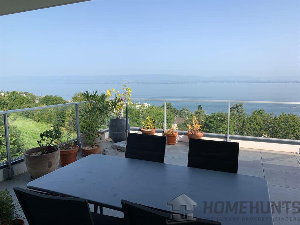 This rare property features a spacious 57 m2 terrace offering breathtaking panoramic views of Lake Geneva. The apartment comprises a fully equipped open-plan kitchen, a bright living room with direct access to the terrace, three bedrooms including a master suite with en-suite shower room, an additional shower room, and a separate toilet. A double garage is included with the property.