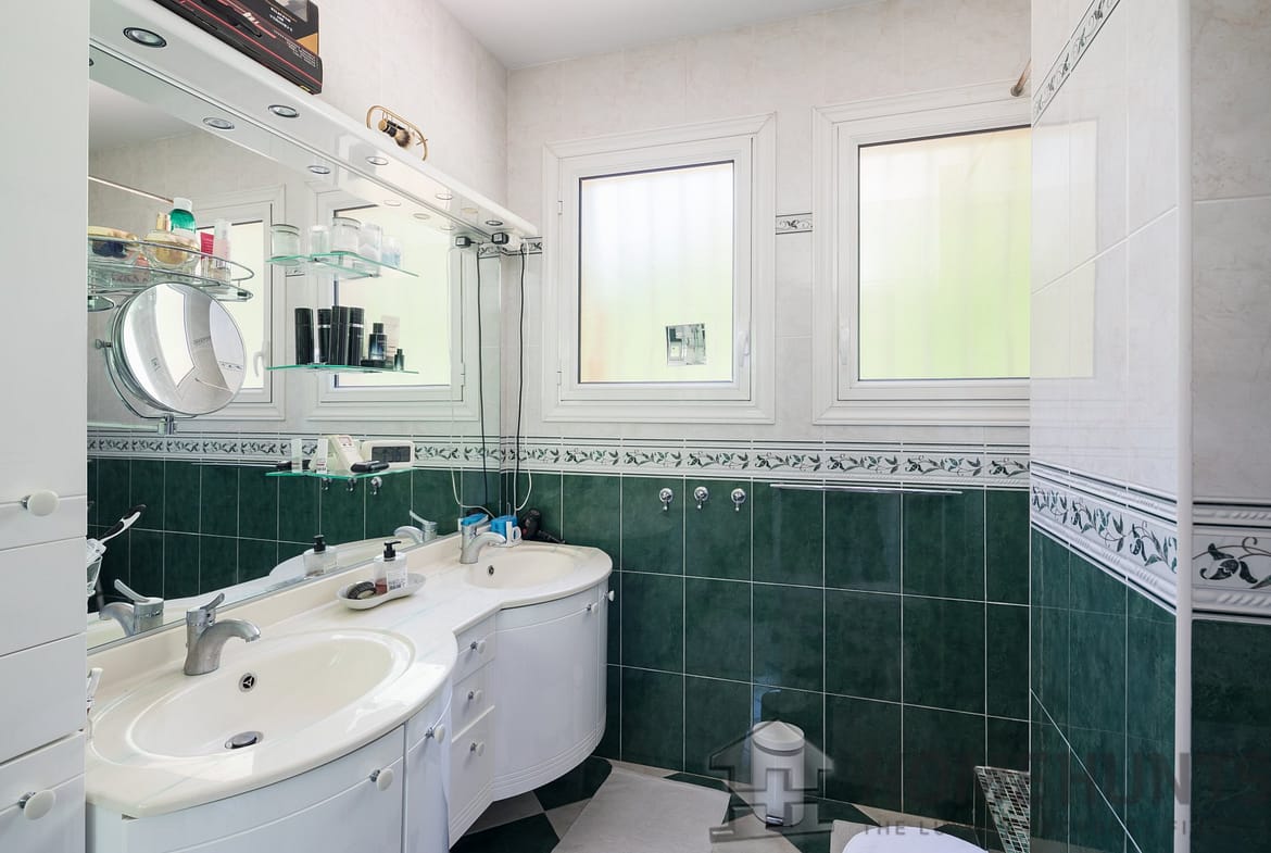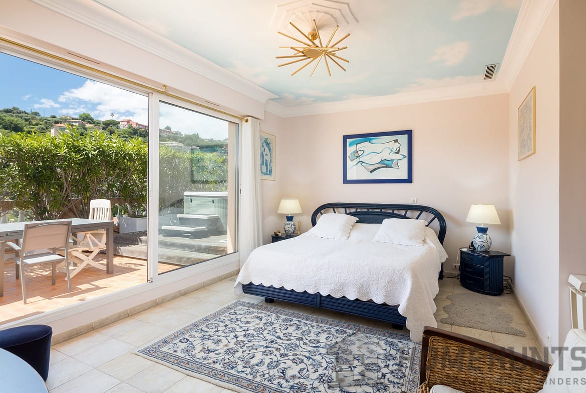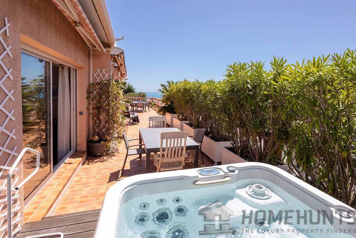 The circular terrace of about 120 m2 also has 2 covered walkways, a covered barbecue, a Jacuzzi, and an automatic watering system.