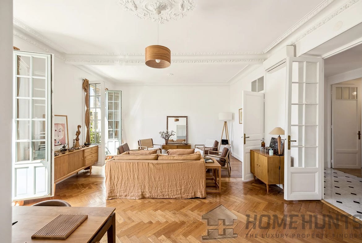 It features a spacious entrance hall in Carrara marble, a double reception room with crafted ceiling moldings and original herringbone oak parquet flooring, opening onto a beautiful west-facing balcony. A large separate kitchen in Carrara marble, fully furnished and equipped, also opens onto the balcony.