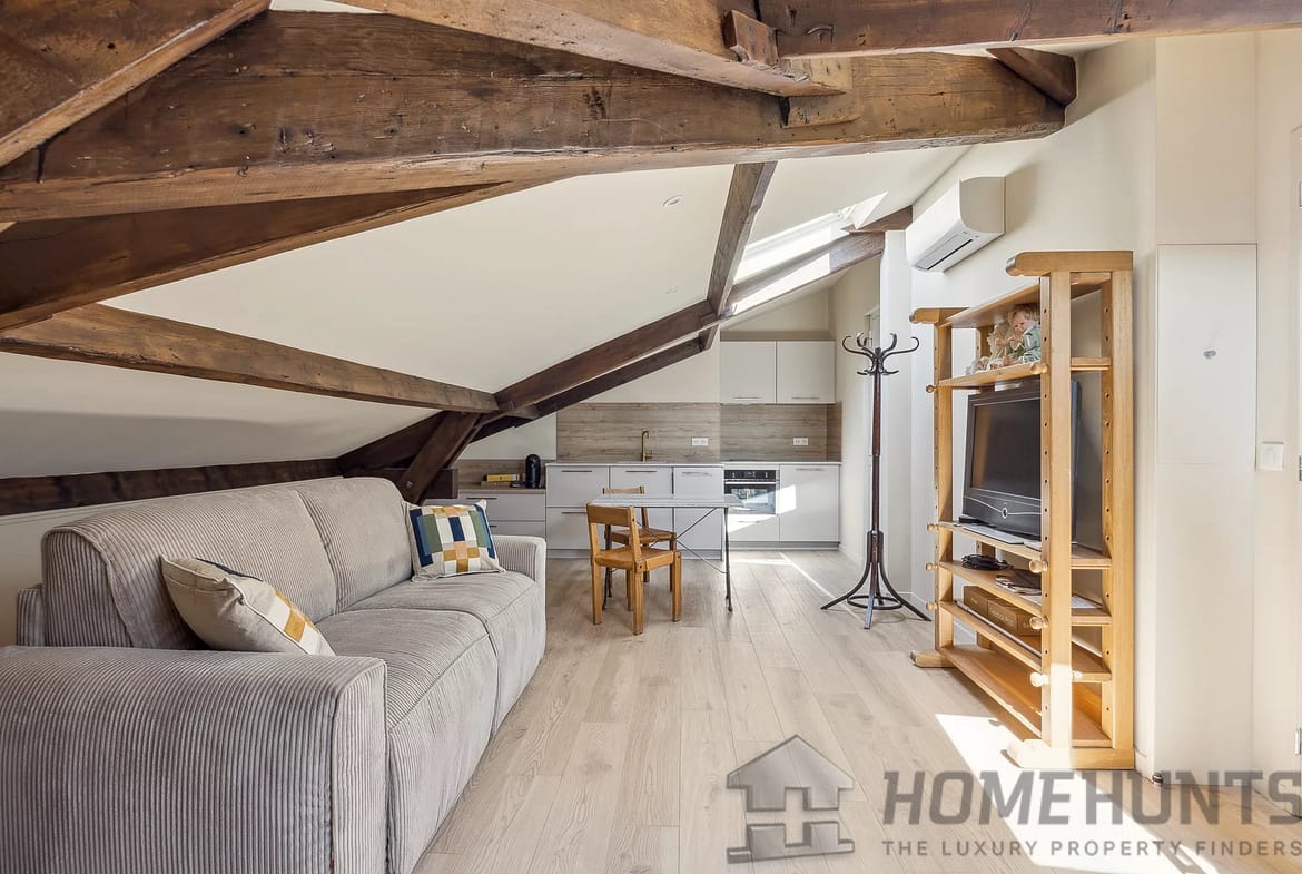 The attic studio, measuring 18.62 m2(approximately 42.12 m2 of floor space), has also been fully renovated. It comprises a bright main room, a fully equipped open kitchen, and a bathroom with WC.