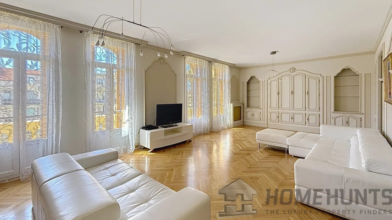 This bright and quiet 200 m2 corner apartment with balconies partially overlooks the Edith Piaf garden in the sought-after carré d’or area of Nice with everything on your doorstep.