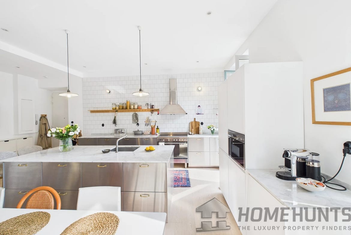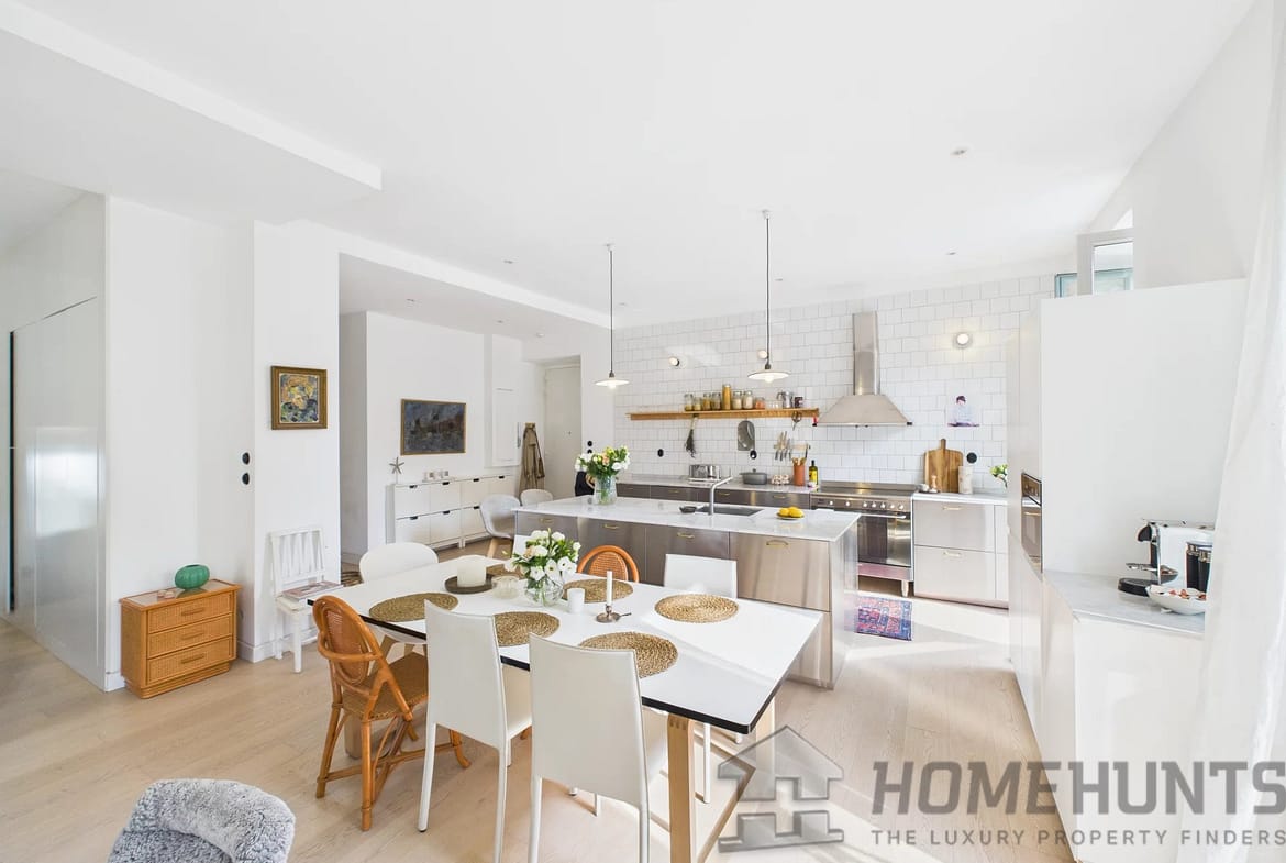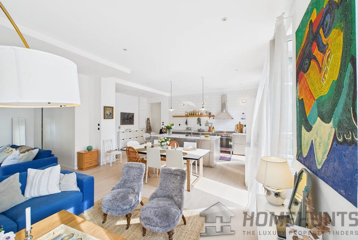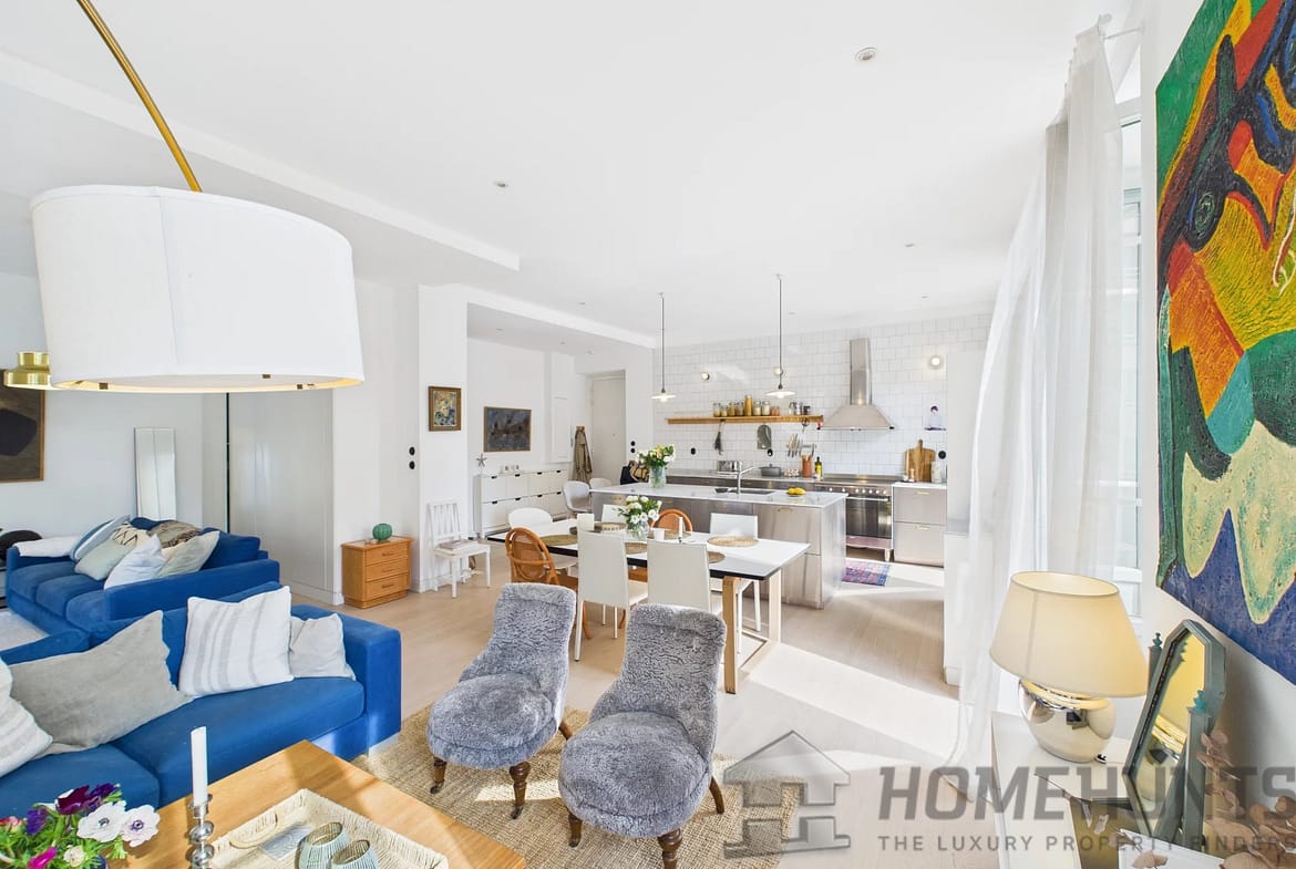 As you step inside, you’re welcomed into a spacious living room seamlessly connected to a fully equipped open-plan kitchen with a kitchen island, offering ample space for cooking and entertaining. The space opens onto a balcony.
