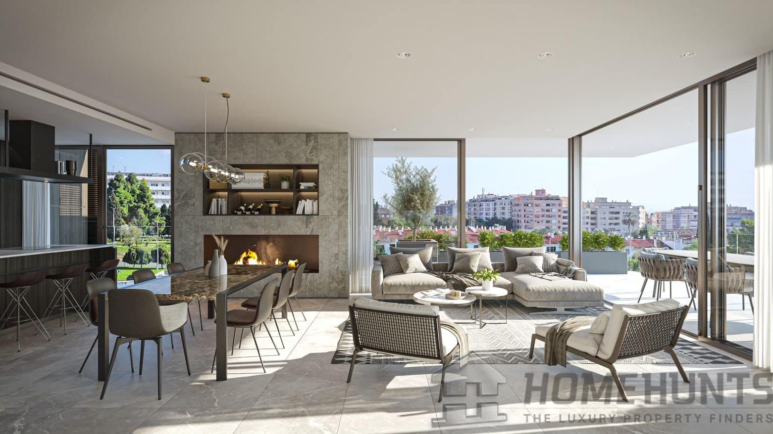 The large windows and terraces become the protagonists to break the limits between interior and exterior living, ensuring natural light throughout. The design of the spaces seeks a formal balance and a good dialogue between the different natural materials. Stone and concrete endow the composition with nobility, while glass gives it modernity.