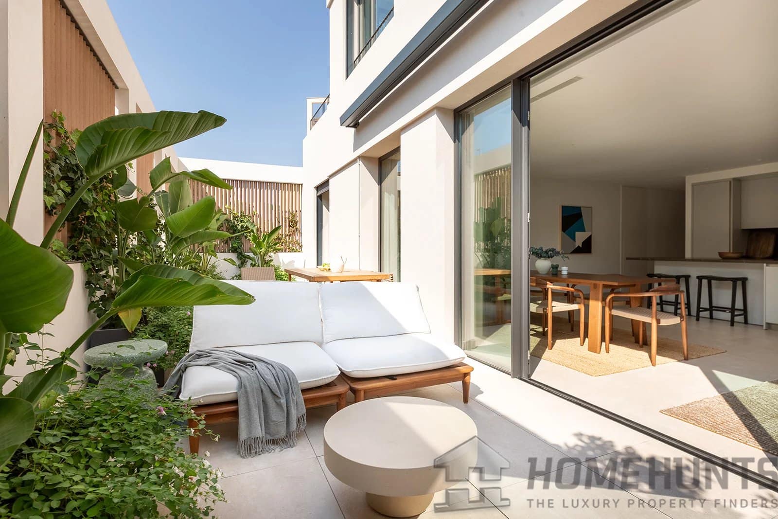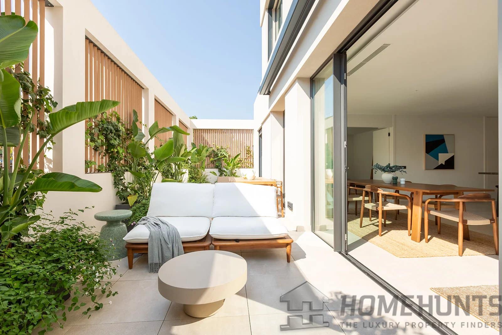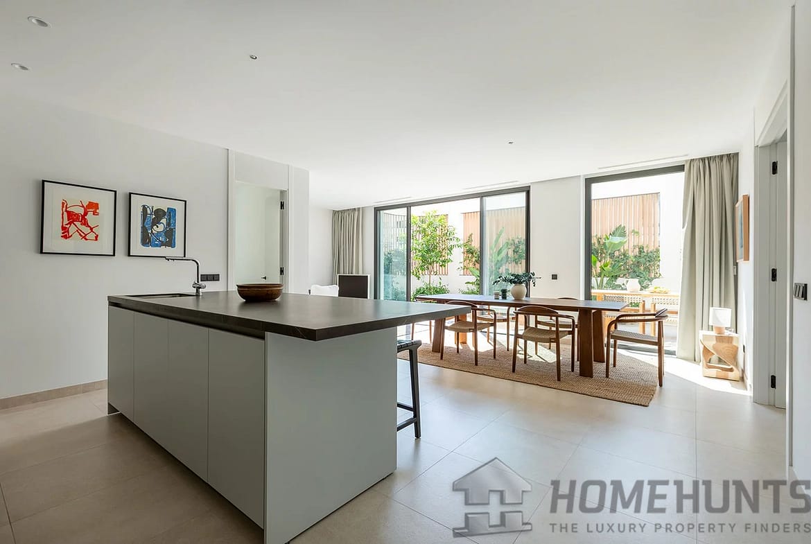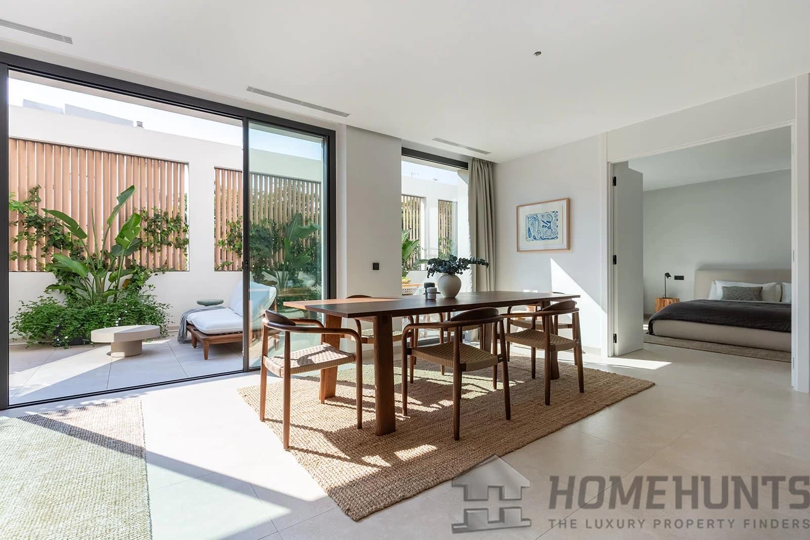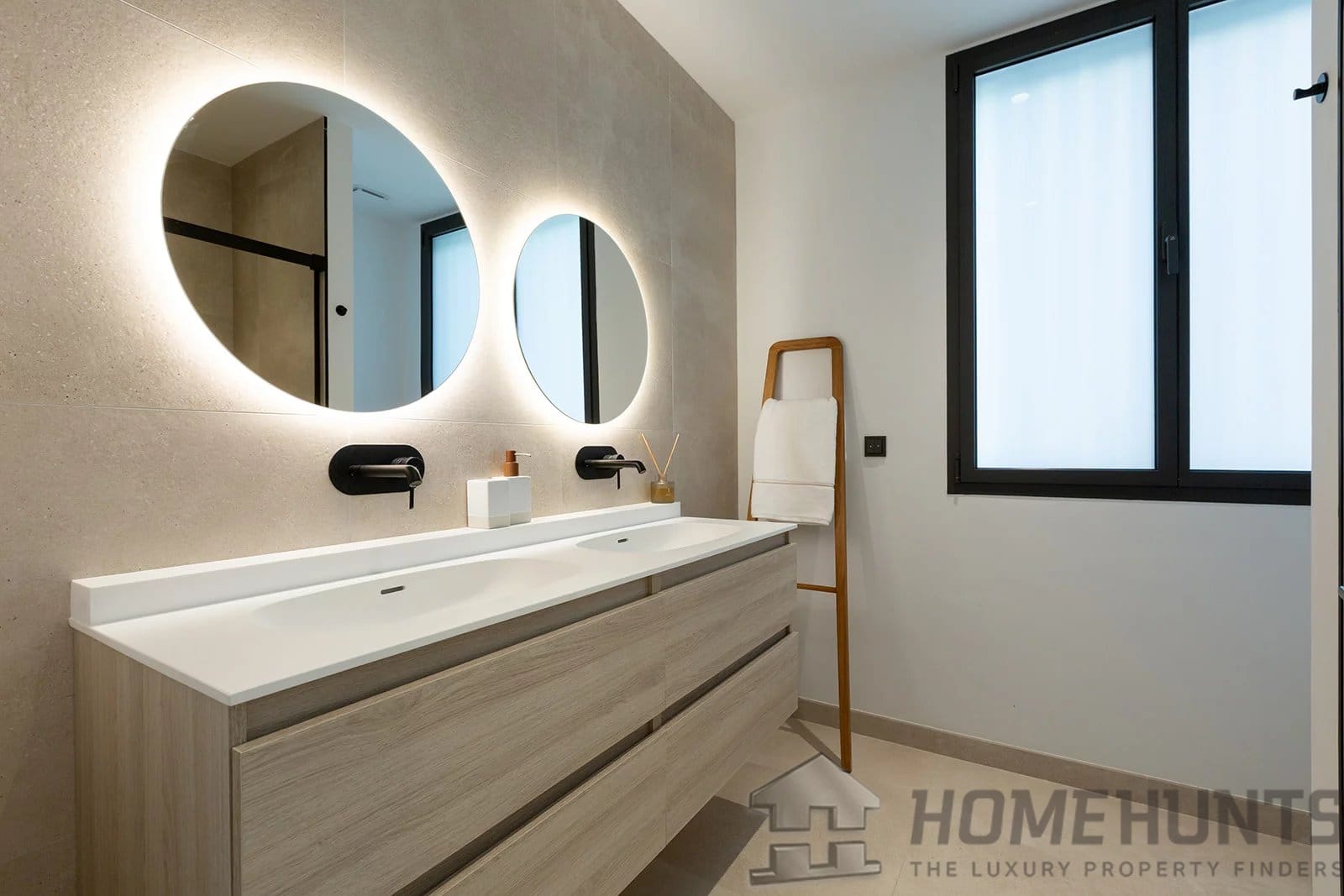 Year-round comfort is ensured with underfloor heating and air conditioning, while Porcelanosa stone-effect porcelain floors and indirect lighting enhance the modern aesthetic.